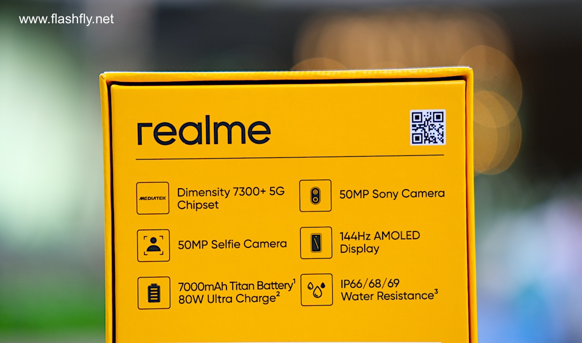 หลังกล่อง realme 15 5G ระบุจุดเด่นไว้ 6 รายการ ได้แก่ ใช้ชิป Dimensity 7300+ 5G ของ MediaTek, กล้องเซลฟี่ 50 ล้านพิกเซล, แบตเตอรี่ขนาดใหญ่ 7000mAh พร้อมชาร์จไว 80W, กล้องหลัก 50 ล้านพิกเซล ใช้เซ็นเซอร์ของ Sony, จอแสดงผล AMOLED ให้อัตราการรีเฟรชสูงถึง 144Hz, ป้องกันฝุ่นและน้ำตามมาตรฐาน IP66 + IP68 + IP69