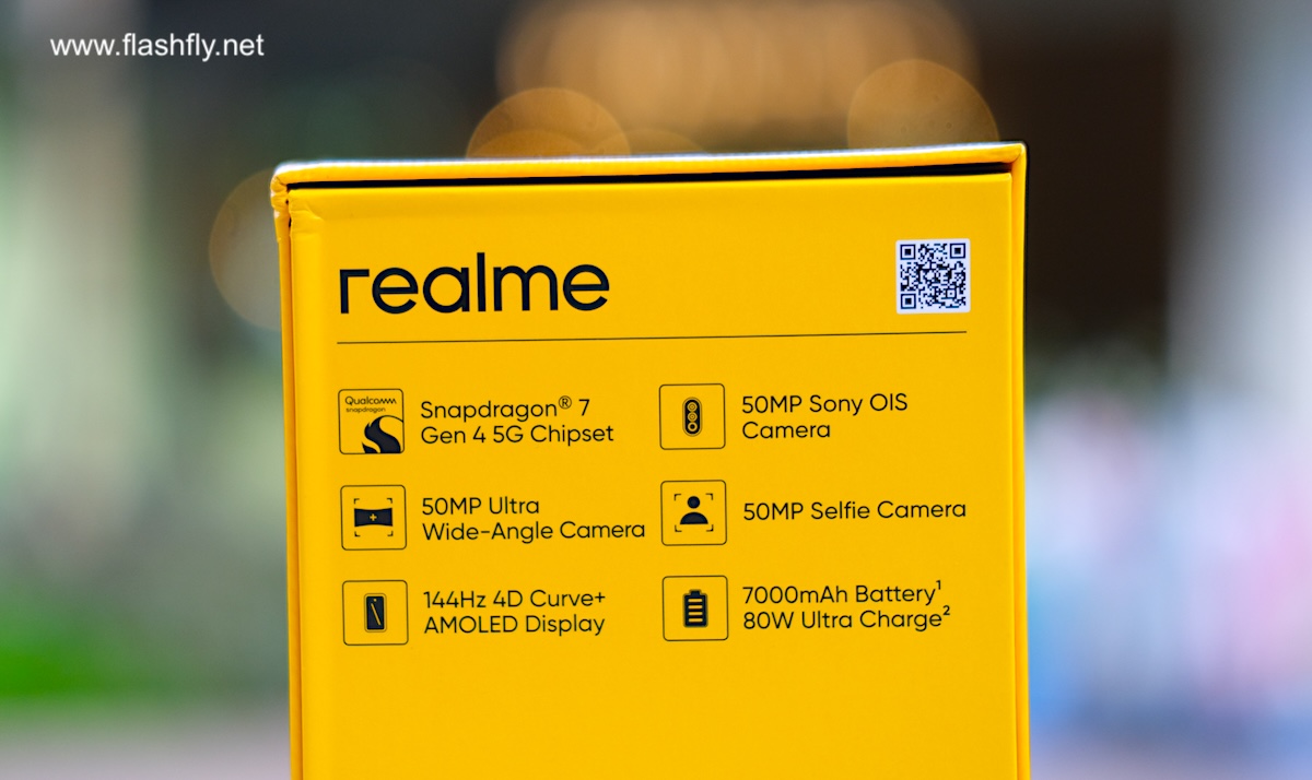 พลิกมาดูหลังกล่องของ realme 15 Pro 5G จะพบจุดเด่นที่สำคัญ 6 รายการ ได้แก่ ชิป Snapdragon 7 Gen 4 5G ของ Qualcomm, กล้อง Ultra Wide ความละเอียด 50 ล้านพิกเซล, จอแสดงผล AMOLED ดีไซน์ขอบจอโค้ง 4D Curve+ ให้อัตราการรีเฟรชสูงถึง 144Hz, กล้องหลัก 50 ล้านพิกเซล ใช้เซ็นเซอร์ของ Sony, กล้องเซลฟี่ 50 ล้านพิกเซล และ แบตเตอรี่ขนาดใหญ่ 7000mAh รองรับชาร์จไว 80W