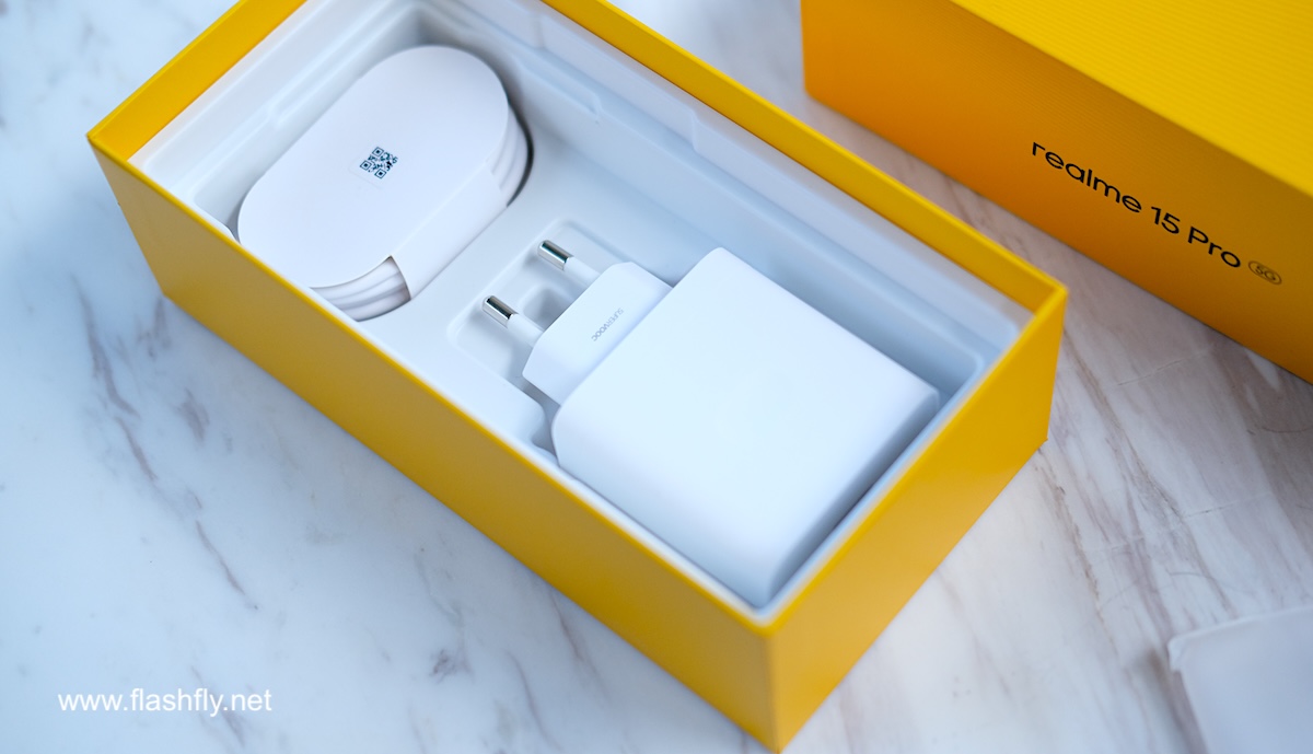 ถัดลงมาพบสมาร์ตโฟน realme 15 Series 5G ถูกเก็บไว้ในซองอย่างดี และชั้นล่างสุดของกล่องเป็นช่องเก็บสายชาร์จ USB Type-C และ หัวชาร์จแบตเตอรี่ 80W Power Adapter