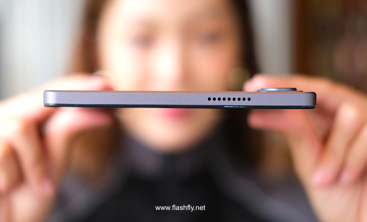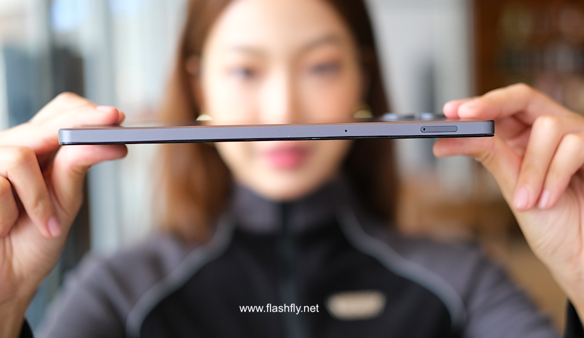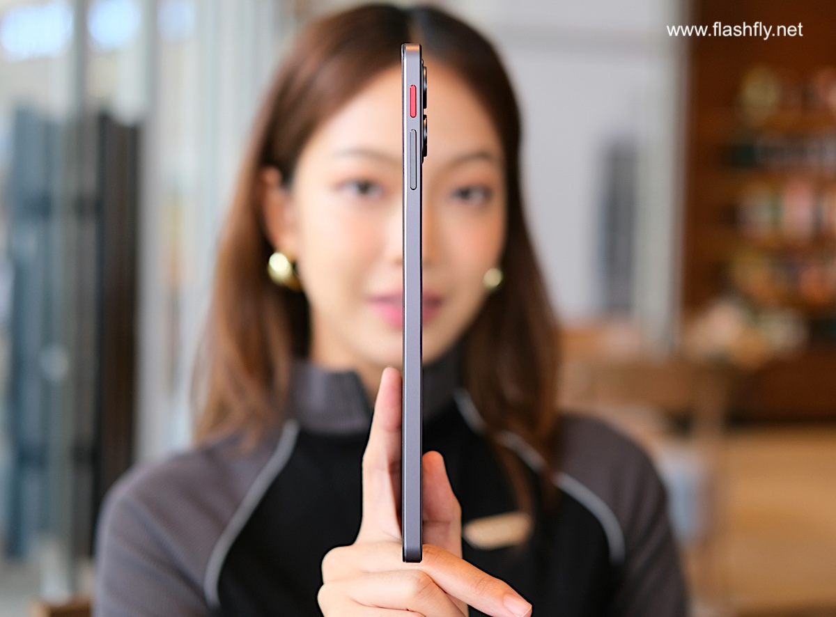 ขอบด้านข้างมีความบางเพียง 7.9 มิลลิเมตร ติดปุ่มเพาเวอร์สีแดงสะดุดตา ถัดลงมาเป็นปุ่มปรับระดับเสียง