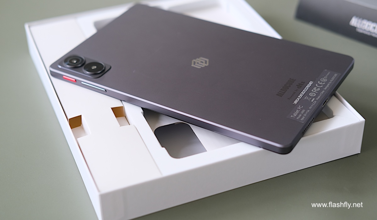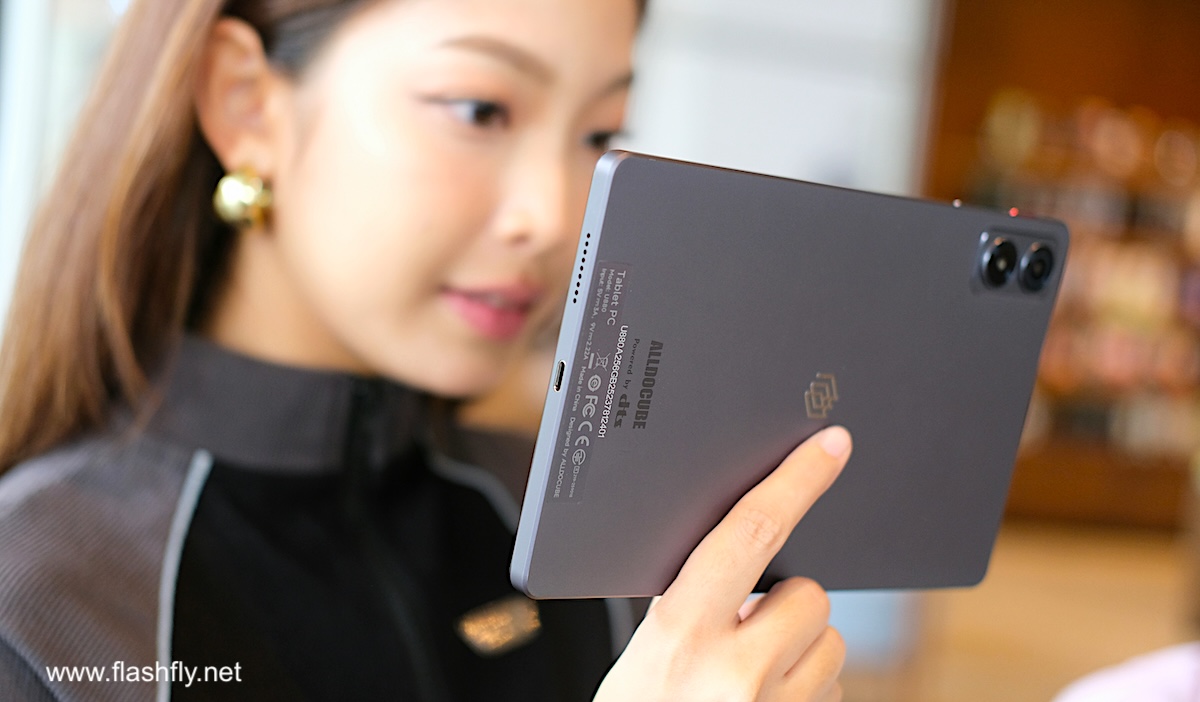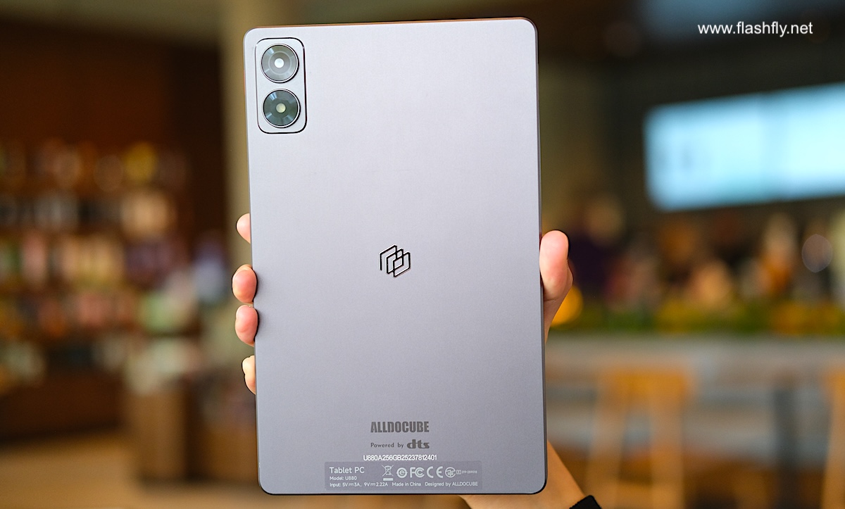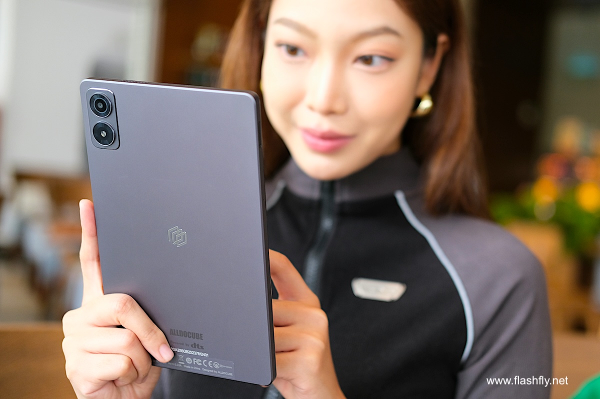 ดีไซน์ด้านหลังเน้นความเรียบหรู ติดตั้งกล้อง 13 ล้านพิกเซล ไว้ในกรอบสี่เหลี่ยม พร้อมแฟลช LED กึ่งกลางพบโลโก้ของ Alldocube และส่วนล่างติดโลโก้ของระบบเสียง DTS