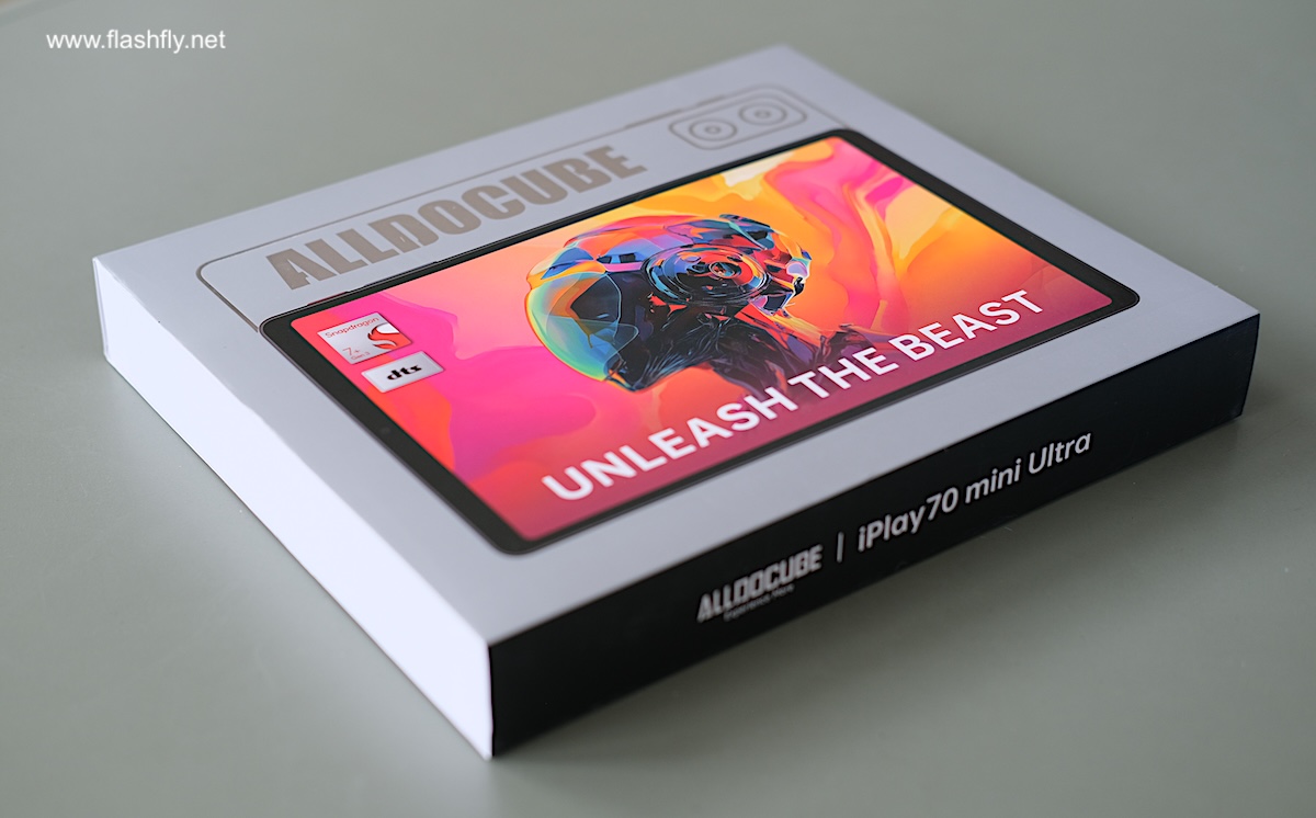 Alldocube iPlay 70 mini Ultra จัดส่งมาในกล่องสีเทาหรือสีเงินขอบกล่องสีดำ ซึ่งที่จริงเป็นปลอกกล่อง กล่องด้านใจจะเป็นสีขาว ฝากล่องพิมพ์รูปภาพด้านหน้าของแท็บเล็ต และเผยให้เห็นดีไซน์บางส่วนของด้านหลัง