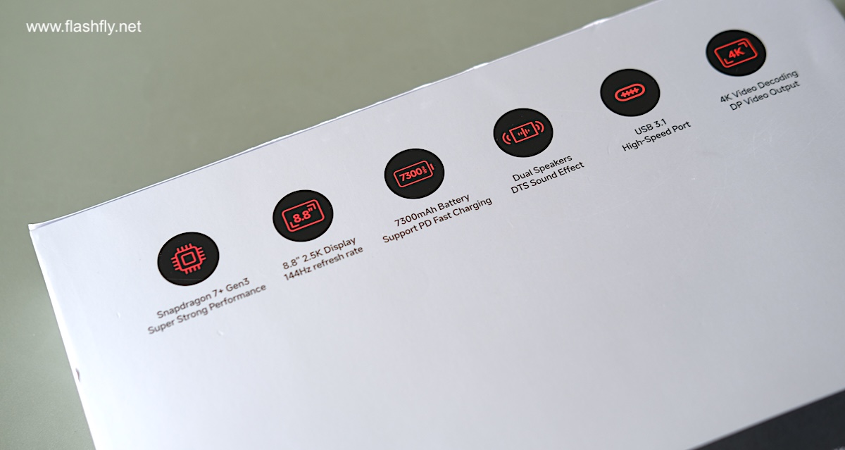 พลิกมาดูหลังกล่องระบุจุดเด่นไว้ 6 อย่าง ได้แก่ ชิปประมวลผล Snapdragon 7+ Gen 3 ของ Qualcomm, จอแสดงผล 2.5K (2560 x 1600) ขนาด 8.8 นิ้ว ให้อัตราการรีเฟรชสูงสุด 144Hz, ความจุแบตเตอรี่ 7300mAh รองรับชาร์จไว PD (Power Delivery), ลำโพงคู่ พร้อมระบบเสียง DTS, สนับสนุนการเชื่อมต่อ USB 3.1 และ รองรับ DisplayPort ส่งภาพออกจอภายนอกด้วยความละเอียดวิดีโอระดับ 4K