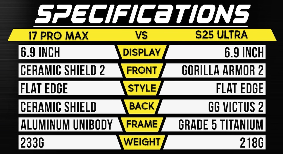 ความน่าสนใจก็คือ iPhone 17 Pro Max ใช้กรอบตัวเครื่องอะลูมิเนียมแบบ Unibody ส่วนที่เป็นกระจกด้านหลังใช้ Ceramic Shield ทนการแตกร้าวได้ดีขึ้น 4 เท่า เมื่อเทียบกับกระจกด้านหลังของรุ่นก่อนๆ และปกป้องด้านหน้าด้วย Ceramic Shield 2 ซึ่งทนต่อการขีดข่วนได้ดีขึ้น 3 เท่า ทางด้าน Galaxy S25 Ultra ใช้กรอบไทเทเนียม และด้านหน้าเป็น Gorilla Armor 2
