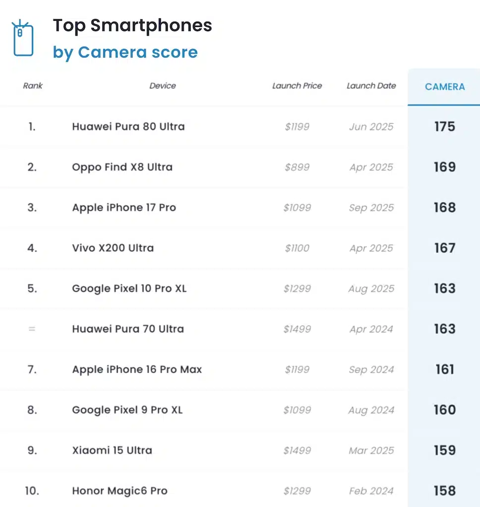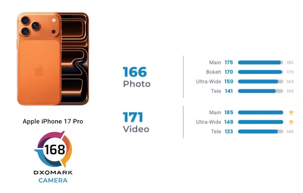 DXOMARK ผู้เชี่ยวชาญในการทดสอบกล้อง ได้รับ iPhone 17 Pro มารีวิวแล้ว และจัดให้อยู่ในอันดับที่ 3 ในฐานะสมาร์ตโฟนที่มีกล้องหลังดีที่สุด จากคะแนนรวม 168 คะแนน เป็นรอง HUAWEI Pura 80 Ultra และ OPPO Find X8 Ultra แต่ทำได้ดีกว่า vivo X200 Ultra และ Google Pixel 10 Pro XL