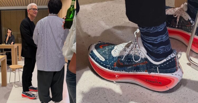 รองเท้า Nike Vomero Plus ของ Tim Cook ได้รับการออกแบบมาเป็นพิเศษ และไม่เคยมีใครเห็นมาก่อน โดยแหล่งข่าวระบุว่ารองเท้ารุ่นพิเศษคู่นี้ ผลิตโดย Sashiko Gals กลุ่มแม่บ้านกว่าสิบคนจากเมืองโอสึจิ ประเทศญี่ปุ่น ซึ่งมีความเชี่ยวชาญด้านศิลปะการเย็บผ้าแบบดั้งเดิม