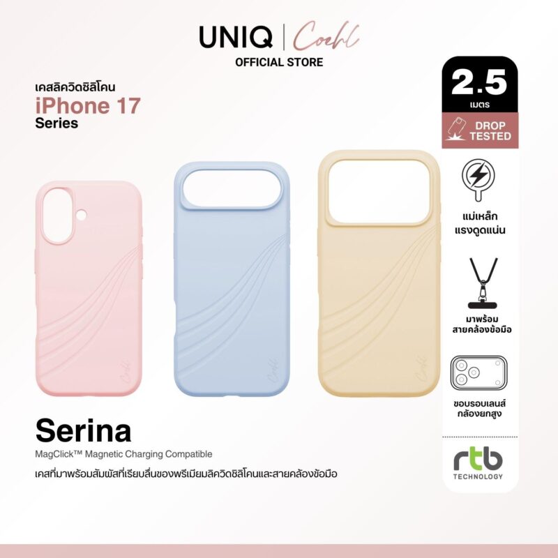 Serina เคสที่โดดเด่นด้วยดีไซน์มินิมอล พร้อมเส้นโค้งที่พลิ้วไหวอย่างอ่อนช้อยเสมือนการบรรจบกันของท้องฟ้า สายลม และผืนทราย ผลิตจากพรีเมียมลิควิดซิลิโคน ให้สัมผัสนุ่ม ลื่นมือ พร้อมเทคโนโลยีเคลือบผิว ช่วยลดการดูดซับฝุ่นและป้องกันรอยนิ้วมือได้อย่างมีประสิทธิภาพ ด้านในบุด้วยไมโครไฟเบอร์เนื้อนุ่มเพื่อรองรับแรงกระแทกและป้องกันรอยขีดข่วน โครงสร้างเคสแบบไฮบริดที่ผสานขอบยืดหยุ่นกับแผ่นหลังแข็งมอบการปกป้องรอบด้านแบบ 360 องศา รองรับการชาร์จแบบแม่เหล็กไร้สายด้วยวงแหวน MagClick™ สามารถรองรับแรงกระแทกจากการตกจากที่สูงได้ถึง 8 ฟุต (2.5 ม.)  มาพร้อมสายคล้องข้อมือที่ผลิตจากเชือกถักเนื้อนุ่ม น้ำหนักเบา ทนทาน วางจำหน่ายในราคา 1,290 บาท