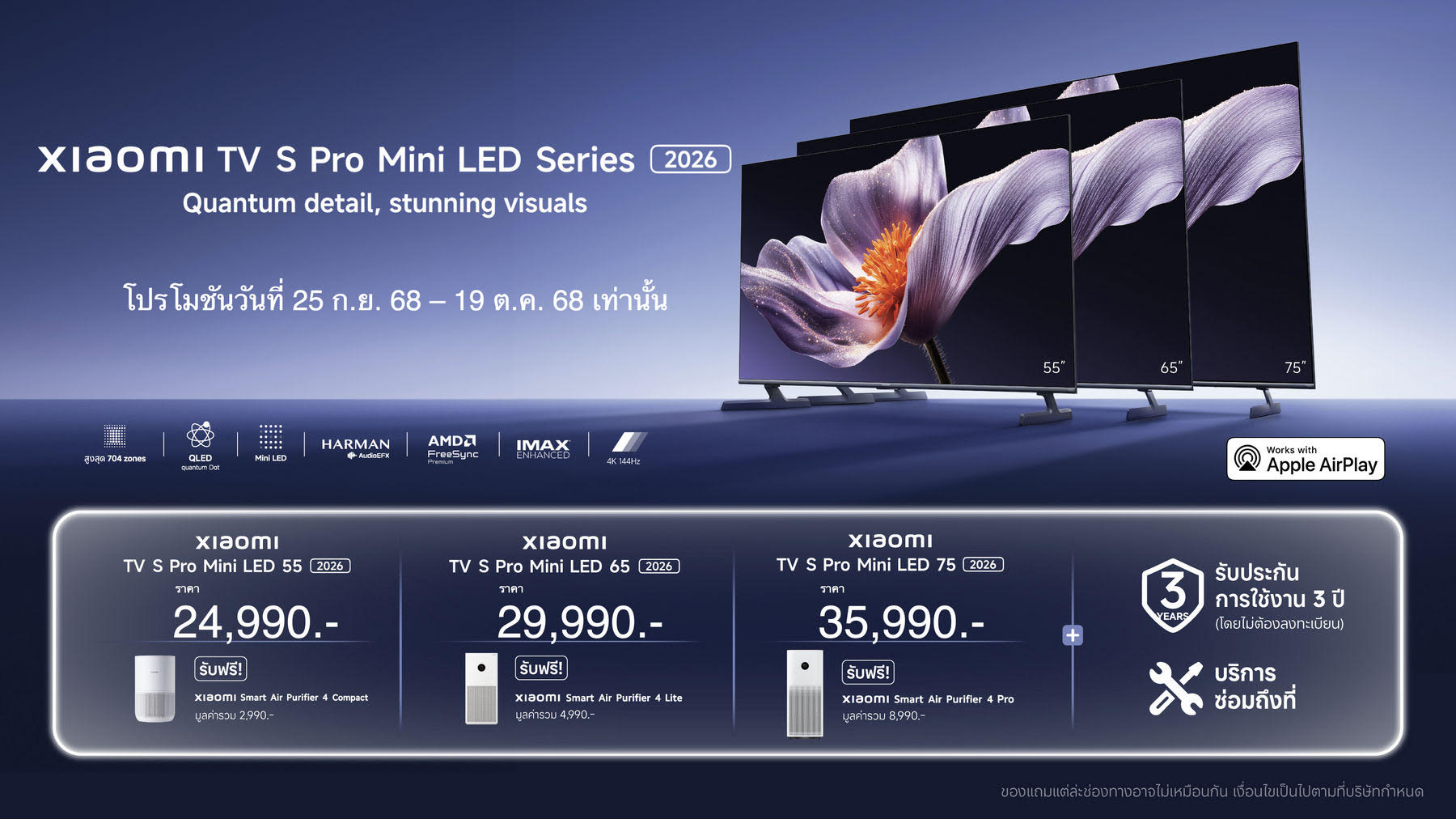 - Xiaomi TV S Pro Mini LED 75 2026 วางจำหน่ายในราคา 39,990 บาท รับฟรี! Xiaomi Smart Air Purifier 4 Pro มูลค่า 8,990 บาท15