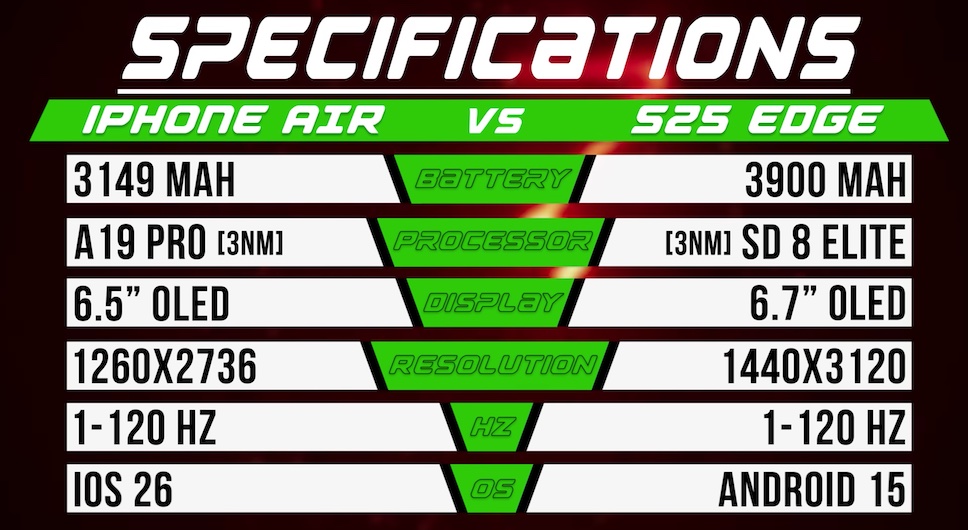 iPhone Air มาพร้อมจอแสดงผล OLED ขนาด 6.5 นิ้ว ใช้ชิป A19 Pro มีความจุแบตเตอรี่ 3149mAh ทางด้าน Galaxy S25 Edge ของ Samsung มาพร้อมจอแสดงผล OLED ขนาด 6.7 นิ้ว ใช้ชิป Snapdragon 8 Elite for Galaxy มีความจุแบตเตอรี่ 3900mAh