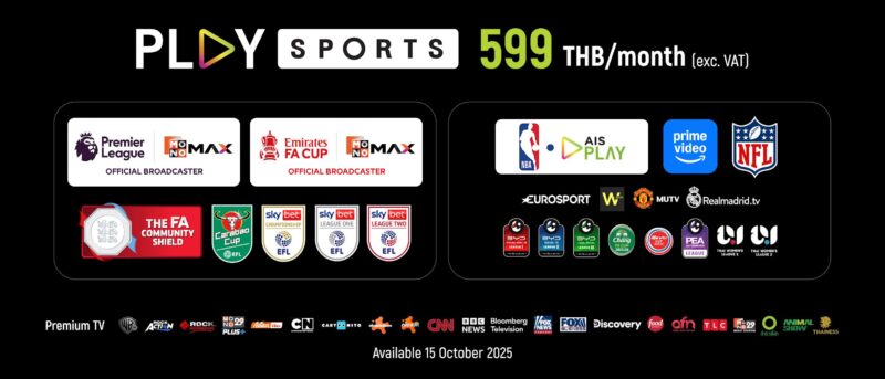 • แพ็กเกจ PLAY SPORTS ราคา 599 บาทต่อเดือน (ไม่รวม VAT) รับชมช่องพรีเมียมและรายการกีฬาระดับโลก รวมถึงการแข่งขันกีฬาสุดมันส์ที่ทุกคนรอคอย ไม่ว่าจะเป็น พรีเมียร์ลีก, NFL และ NBA ผ่าน AIS PLAY พร้อมเต็มอิ่มกับคอนเทนต์จาก Prime Video และ Monomax สมัครกด *678*88# โทรออก (เปิดให้สมัครตั้งแต่วันที่ 15 ตุลาคม 2568 เป็นต้นไป)