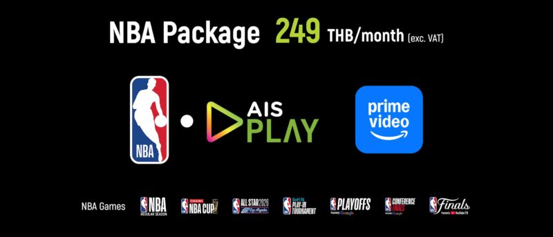• แพ็กเกจ NBA 2025-26 รายเดือน ราคา 249 บาทต่อเดือน (ไม่รวม VAT) ดูสดทุกแมตช์สำคัญ ทั้งฤดูกาลปกติ รอบเพลย์ออฟ และอีเวนต์พิเศษ All-Star Weekend ผ่าน AIS PLAY แพ็กเกจนี้ยังมาพร้อม Prime Video ให้คุณเข้าถึงความบันเทิงระดับโลก พร้อมชมการแข่งขันในฤดูกาลปกติ และแมตช์ใหญ่สุดเอ็กซ์คลูซีฟ รวมถึง Emirates NBA Cup, Play-In Tournament และ NBA Finals สมัครกด *678*23# โทรออก (รับชมได้ถึงวันที่ 30 มิถุนายน 2569)
