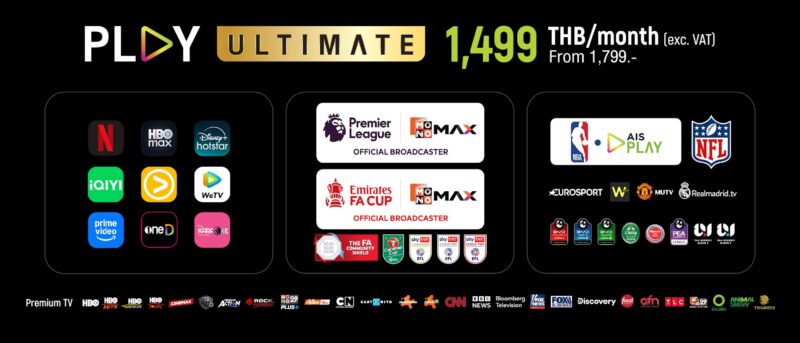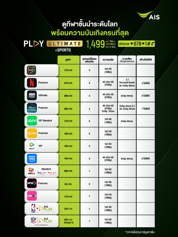 • แพ็กเกจ PLAY ULTIMATE+SPORTS รายเดือน ราคา 1,499 บาทต่อเดือน นาน 12 เดือน หลังจากนั้นค่าบริการ 1,799 บาท (ไม่รวม VAT) รวมที่สุดของความบันเทิงและกีฬาครบจบในแพ็กเกจเดียว จัดเต็มช่องพรีเมียมระดับโลกและคอนเทนต์ รวมถึงรายการกีฬาชั้นนำอย่าง พรีเมียร์ลีก, NFL และ NBA ที่สามารถรับชมได้บน AIS PLAY และความบันเทิงจากสตรีมมิงแพลตฟอร์มชั้นนำ ทั้ง, Netflix, HBO Max, Disney+ Hotstar, Prime Video, iQIYI, Viu, WeTV, AIS KARAOKE, Monomax และ oneD สมัครกด *678*1# โทรออก