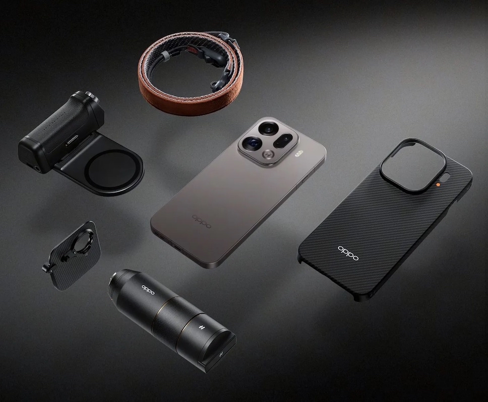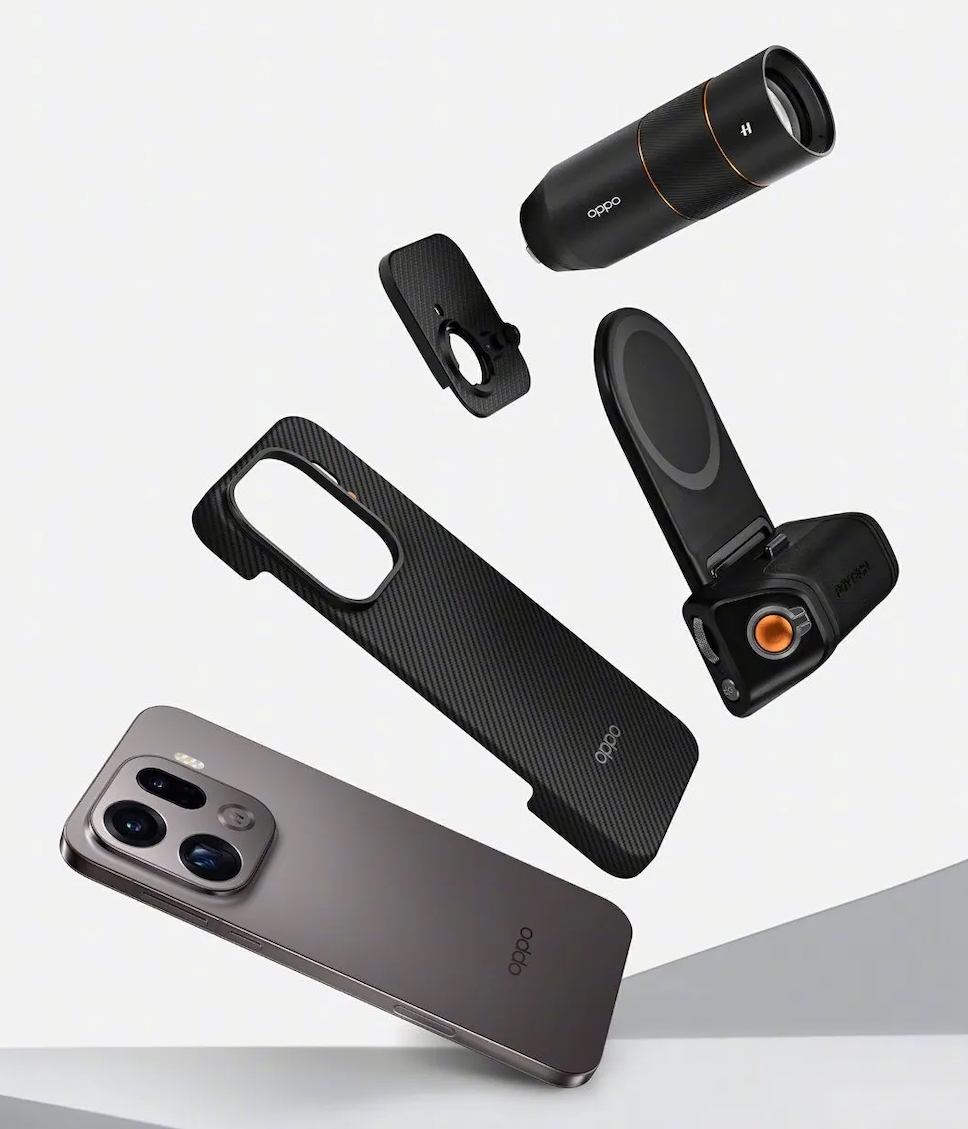 Hasselblad Professional Imaging Kit สำหรับ OPPO Find X9 Pro ประกอบด้วย เคสแม่เหล็กที่ทำจากเส้นใยอะรามิด, ชุดเลนส์เทเลโฟโต้ Hasselblad, กริปแม่เหล็กสำหรับถ่ายภาพ และสายคล้องไหล่จาก Hasselblad