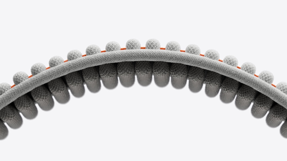 Apple Vision Pro รุ่นใหม่ มาพร้อมสายคาดศีรษะแบบคู่ Dual Knit Band ที่มีให้เลือก 3 ขนาด ผลิตจากสายรัด 2 เส้นที่ถักเป็นชิ้นเดียว สายรัดด้านบนพาดผ่านด้านบนของศีรษะ และสายรัดด้านล่างพาดผ่านด้านหลังของศีรษะ สายรัดด้านล่างยังมีแผ่นทังสเตนเสริมช่วยถ่วงน้ำหนักเพื่อความสบาย สมดุล และความมั่นคงยิ่งขึ้น ผู้สวมใส่สามารถปรับความกระชับของสายรัดทั้งคู่ได้ด้วยปุ่ม Fit Dial