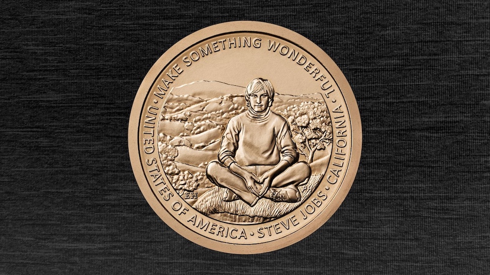 Steve Jobs ในวัยหนุ่ม ถูกใช้เป็นต้นแบบลายพิมพ์นูนบนเหรียญที่ระลึกดังกล่าว โดยอดีตซีอีโอของ Apple อยู่ในชุดที่คุ้นตา สวมเสื้อคอเต่า กางเกงยีนส์ และ รองเท้าผ้าใบ ฉากหลังเป็นเนินเขาที่ปกคลุมไปด้วยต้นโอ๊ก ซึ่งเป็นทิวทัศน์อันงดงามของแคลิฟอร์เนียตอนเหนือ