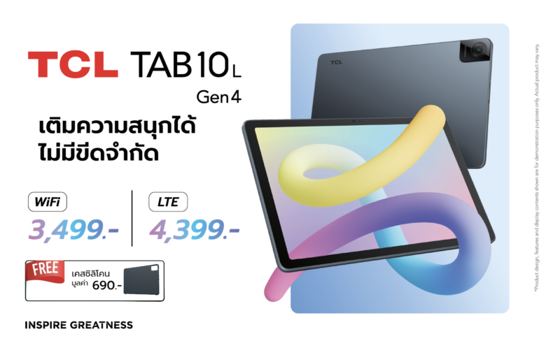 พร้อมกันนี้ TCL ยังเปิดตัวแท็บเล็ตใหม่ TCL Tab10L Gen4 ที่ออกแบบมาเพื่อการใช้งานในชีวิตประจำวันของทุกคนในครอบครัว มาพร้อมหน้าจอขนาด 10.1 นิ้ว ความละเอียด HD, ลำโพงคู่สเตอริโอ, น้ำหนักเบาเพียง 426 กรัม เหมาะสำหรับการเรียนออนไลน์ ดูหนัง ฟังเพลง หรือวิดีโอคอล ขับเคลื่อนด้วยชิปประมวลผล Quad-core, RAM 4GB (พร้อม Extended RAM อีก 4GB), ROM 64GB รองรับ MicroSD Card สูงสุด 512GB และแบตเตอรี่ขนาด 6,000 mAh ใช้งานได้ยาวนานตลอดวัน