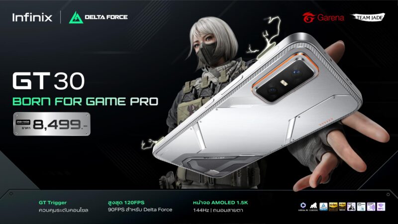 อินฟินิกซ์ (Infinix) แบรนด์สมาร์ทโฟนระดับโลกที่คุ้มค่า ครบครันทุกการใช้งาน และตอบโจทย์ไลฟ์สไตล์คนรุ่นใหม่ ประกาศเปิดตัว Infinix GT 30 อย่างเป็นทางการทั่วโลก เสริมทัพตระกูล เสริมทัพซีรีส์ GT ด้วยสมาร์ทโฟนเกมมิ่งดีไซน์พรีเมียม ที่ผสานเทคโนโลยีระดับแข่งขันเข้ากับประสิทธิภาพการเล่นเกมขั้นสุด โดดเด่นด้วย ปุ่มสัมผัส GT Trigger (Capacitive Shoulder Triggers) ช่วยให้ควบคุมเกมได้อย่างแม่นยำ และ หน้าจอ AMOLED ความละเอียด 1.5K รีเฟรชเรต 144Hz มอบภาพคมชัด สีสันสด และการตอบสนองที่ลื่นไหลทุกจังหวะการเล่น อินฟินิกซ์ยังสร้างประสบการณ์ความสนุกระดับโลกด้วยการร่วมมือกับเกมยอดนิยม Delta Force เพื่อมอบประสบการณ์เกมระดับทัวร์นาเมนต์ให้กับผู้ใช้งานวัยรุ่นทั่วโลก ภายในขับเคลื่อนด้วย ชิปเซ็ต MediaTek Dimensity 7400 5G รุ่นใหม่ล่าสุด ที่มอบพลังการประมวลผลแรงเต็มพิกัด พร้อมเทคโนโลยีระบายความร้อน 3D Vapor Cloud Chamber (3DVCC) ที่พัฒนาโดยอินฟินิกซ์เสริมด้วยแผ่นกราไฟต์นำความร้อนพิเศษครอบคลุมทั้งเมนบอร์ด หน้าจอ แบตเตอรี่ และลำโพง เพื่อกระจายความร้อนได้อย่างมีประสิทธิภาพ ทำให้เครื่องทำงานได้เสถียรและเย็นอยู่เสมอ แม้ในช่วงเล่นเกมหรือใช้งานหนักต่อเนื่อง