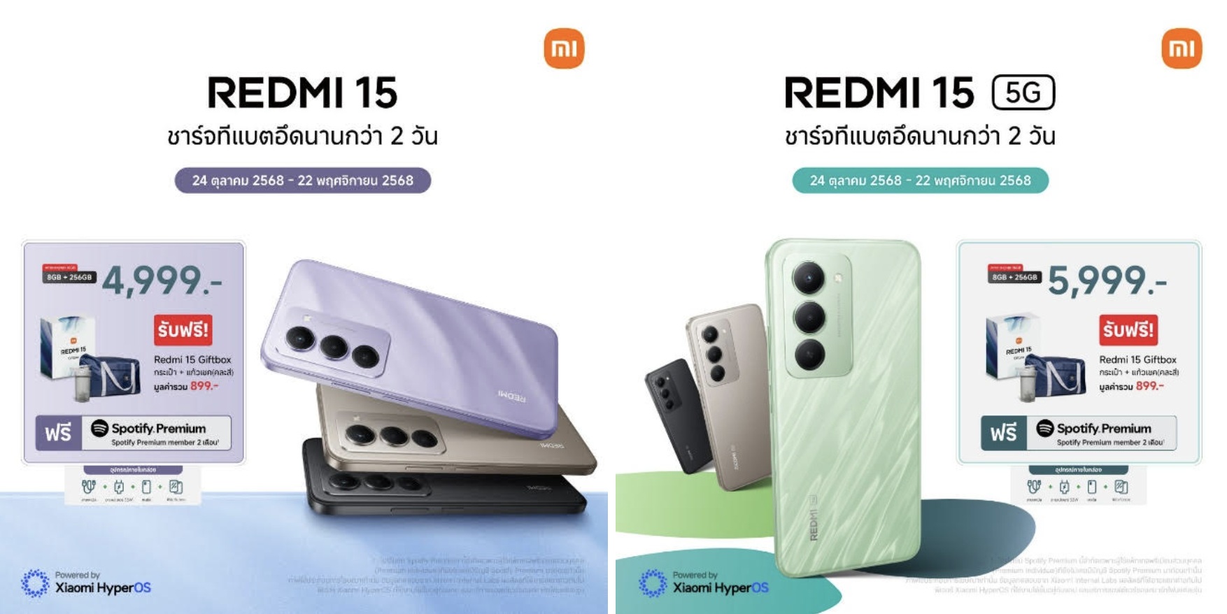 • REDMI 15 รุ่นความจุ 8GB + 256GB มีให้เลือก 3 สี ได้แก่ Sandy Purple, Titan Gray และ Midnight Black2 วางจำหน่ายในราคา 4,999 บาท ที่ Xiaomi Store, ร้านตัวแทนจำหน่ายที่ร่วมรายการทั่วประเทศ และช่องทางการจัดจำหน่ายทางออนไลน์ พิเศษ! เมื่อซื้อ REDMI 15 ระหว่างวันที่ 24 ตุลาคม 2568 – 22 พฤศจิกายน 2568 รับฟรี REDMI 15 Giftbox กระเป๋าและแก้วเชคคละสีมูลค่ารวม 899 บาท และฟรี! Spotify Premium member 2 เดือนเฉพาะผู้ใช้แพ็กเกจพรีเมียมส่วนบุคคล (Premium Individual)17