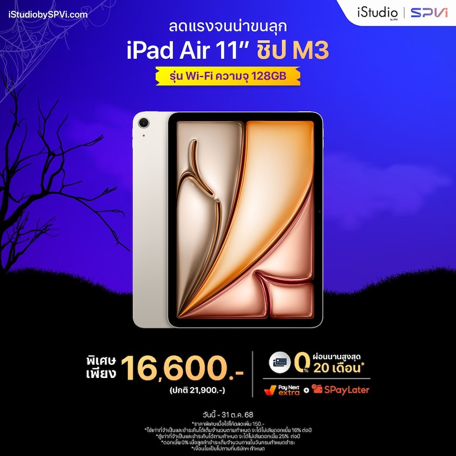 สามารถเป็นเจ้าของ iPad Air 11″ ชิป M3 ได้ง่ายขึ้นกับโปรโมชันผ่อน 0% นานสูงสุด 20 เดือน (เงื่อนไขเป็นไปตามที่บริษัทฯ กำหนด) หรือผ่อนแบบไม่ใช้บัตรผ่าน Pay Next extra และ SPayLater