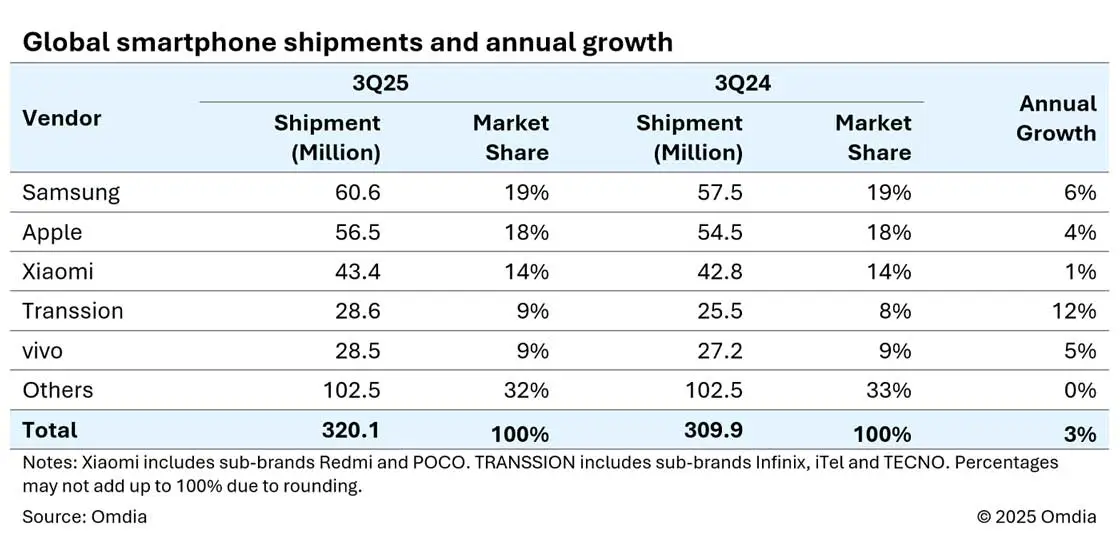 Samsung ยังเป็นผู้นำในตลาดสมาร์ทโฟนทั่วโลก โดยมียอดจัดส่ง 60.6 ล้านเครื่อง ในไตรมาสที่ 3 ปีนี้ เพิ่มขึ้น 6% เมื่อเทียบกับไตรมาสเดียวกันของปี 2024 อ้างอิงจากรายงานของ Omdia