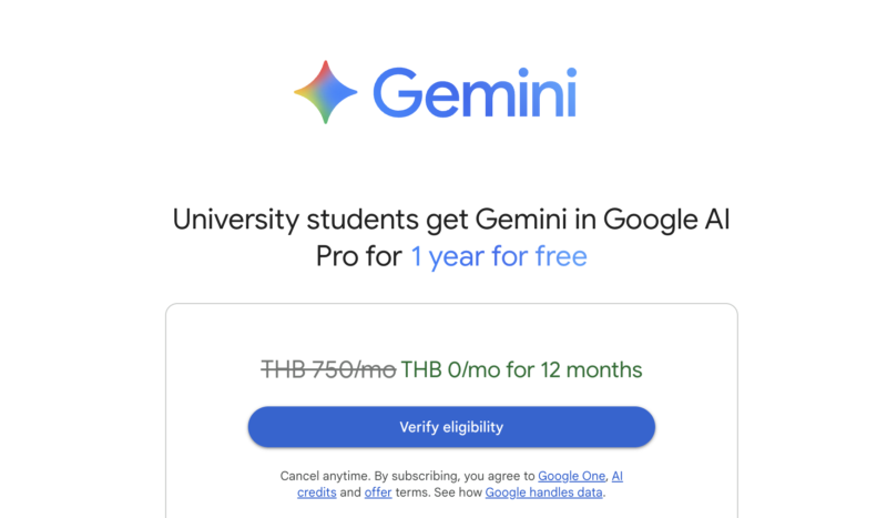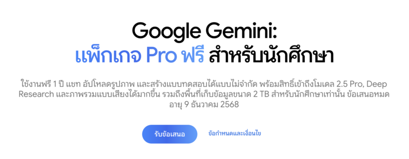 สำหรับเยาวชน นักเรียน นิสิต นักศึกษา ตรวจสอบหลักเกณฑ์การรับสิทธิ์ และช่องทางการลงทะเบียนได้ที่ https://gemini.google/th/students/?hl=th