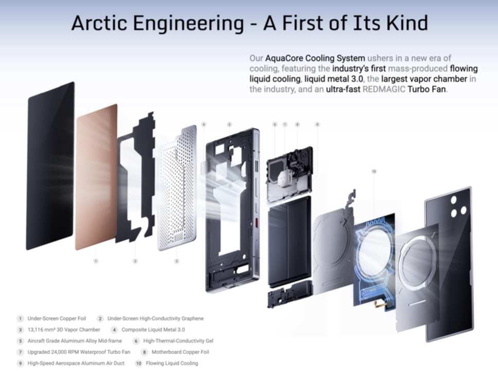 RedMagic เปิดตัวเกมมิ่งสมาร์ทโฟนรุ่นใหม่ RedMagic 11 Pro ที่มาพร้อมระบบระบายความร้อนด้วยของเหลว เรียกว่า AquaCore Cooling System และยังโชว์ให้เห็นการทำงานของระบบระบายความร้อนบนฝาหลังแบบโปร่งใส สำหรับสี Silver Subzero กับสี Black Nightfreeze ขณะที่ Matte Black Cryo เป็นฝาหลังแบบทึบ