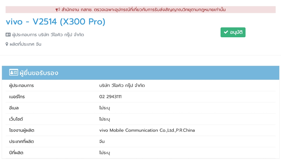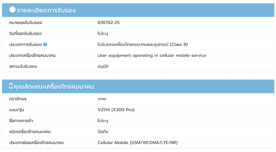 สำนักงาน กสทช. ของไทย ให้การรับรองสมาร์ตโฟน vivo X300 Pro เรียบร้อยแล้ว ซึ่งเป็นสัญญาณว่าเรือธงรุ่นใหม่ของ vivo พร้อมแล้วสำหรับการทำตลาดในไทย และคาดว่าจะเปิดตัวทางการในเร็วๆ นี้