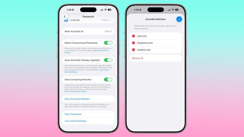 การตั้งค่าแอป Passwords ใน Settings มีตัวเลือกสำหรับจัดการเว็บไซต์ที่ไม่บันทึกรหัสผ่านเมื่อลงชื่อเข้าใช้