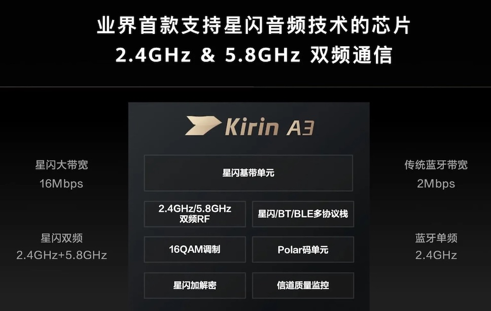 Kirin A3 เป็นชิปควบคุมเสียงรุ่นที่ 3 ที่ Huawei พัฒนาขึ้นเอง ขับเคลื่อนด้วยโปรเซสเซอร์ 6-core ที่ใช้ Ascend Nano NPU ช่วยให้สามารถใช้งานอัจฉริยะพร้อมกันได้หลายอุปกรณ์ พร้อมสถาปัตยกรรมการลดเสียงรบกวนแบบใหม่ สามารถติดตามและยับยั้งการเปลี่ยนแปลงของเสียงรบกวนอย่างฉับพลันได้อย่างรวดเร็ว รองรับการเชื่อมต่อ NearLink ให้ความเร็วในการรับส่งข้อมูลสูงสุด 16Mbps เร็วกว่า Bluetooth ถึง 8 เท่า และรองรับการสื่อสารที่ความถี่ 2.4GHz และ 5.8GHz ช่วยให้สามารถสลับการใช้งานได้อย่างยืดหยุ่น