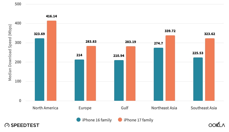 จากแผนภูมิของ Ookla แสดงให้เห็นว่า iPhone 17 มีความเร็ว Wi-Fi เพิ่มขึ้นอย่างชัดเจนในทุกภูมิภาคของโลก เมื่อเทียบกับ iPhone 16 ตัวอย่างเช่น ในอเมริกาเหนือ Ookla ระบุว่า iPhone 16 มีความเร็วในการดาวน์โหลดเฉลี่ย 323 Mbps ขณะที่ Wi-Fi ของ iPhone 17 มีความเร็วในการดาวน์โหลดเฉลี่ย 416 Mbps