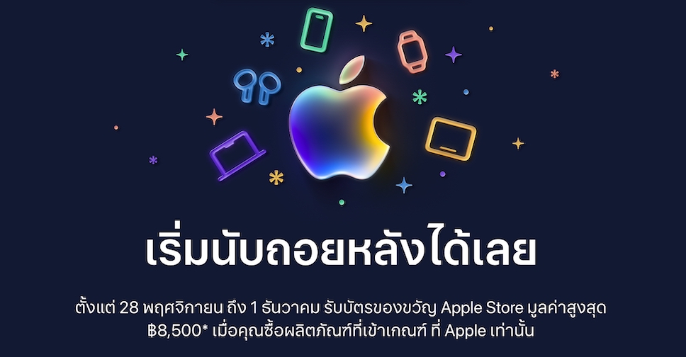 Apple กิจกรรมช้อปปิ้ง Black Friday 2025 ตั้งแต่ 28 พฤศจิกายน ถึง 1 ธันวาคม 2025 มอบบัตรของขวัญ Apple Store มูลค่าสูงสุด 8,500 บาท เมื่อซื้อผลิตภัณฑ์ที่เข้าร่วมรายการ