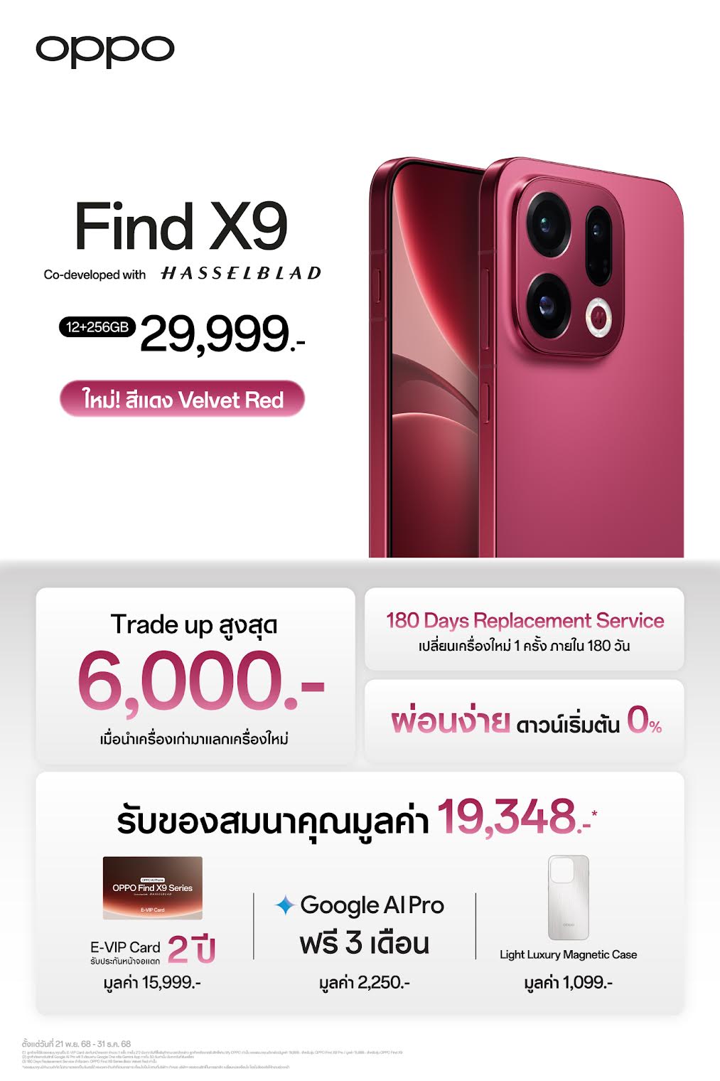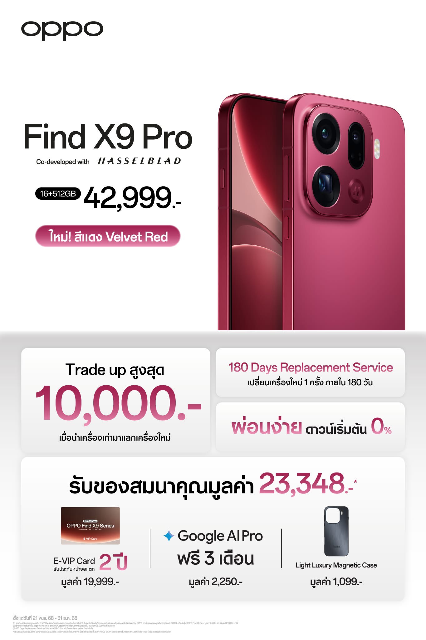 OPPO Find X9 Pro สีแดง Velvet Red ราคา 42,999 บาท มาพร้อม Trade up สูงสุด 10,000 เมื่อนำเครื่องเก่ามาแลกเครื่องใหม่ พร้อม 180 Days Replacement Service เปลี่ยนเครื่องใหม่ 1 ครั้งภายใน 180 วัน ผ่อนง่ายดาวน์เริ่มต้น 0% และรับของสมนาคุณมูลค่า 23,348 บาท E-VIP Card รับประกันหน้าจอแตก 2 ปี มูลค่า 19,999 บาท Google AI Pro ฟรี 3 เดือน มูลค่า 2,250 บาท และ Light Luxury Magnetic Case มูลค่า 1,099 บาท