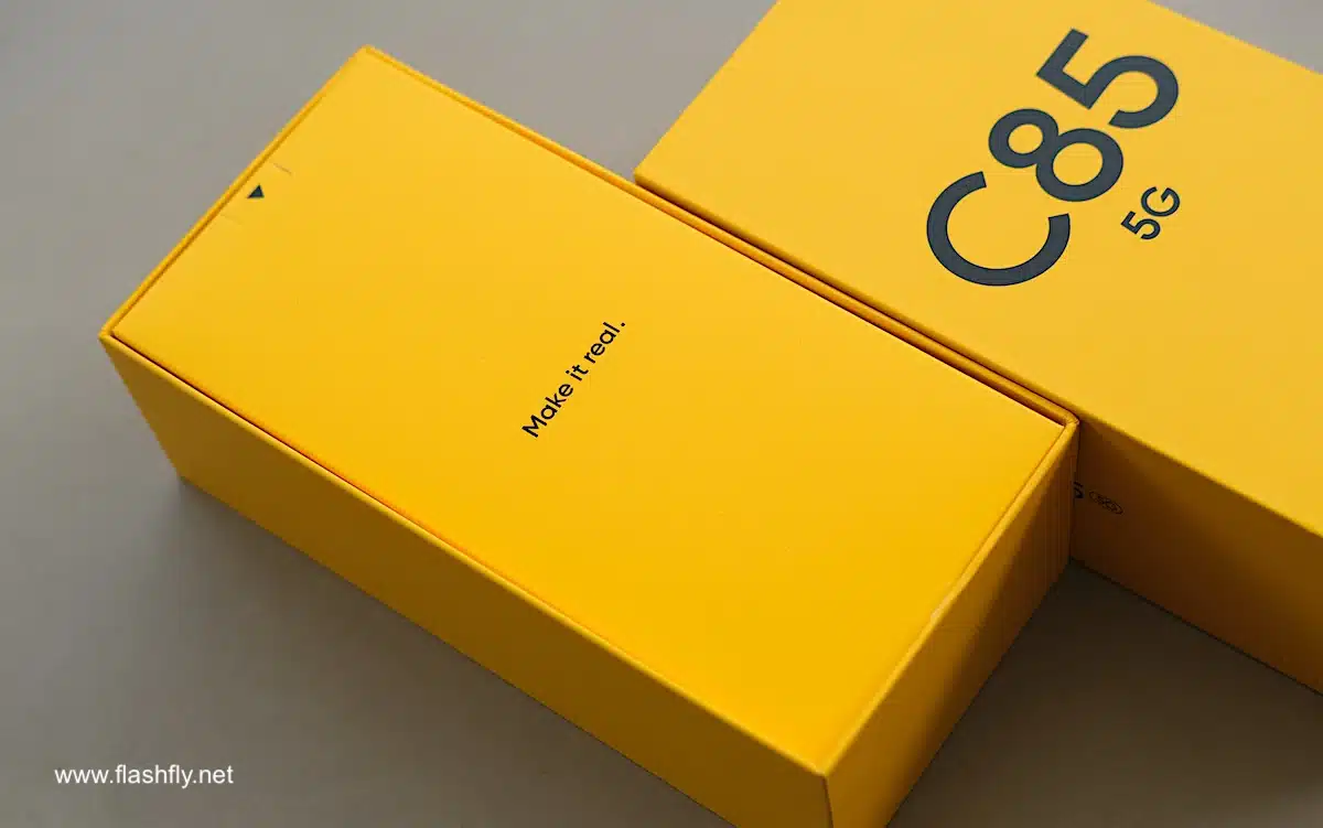 realme C85 5G บรรจุไว้ในกล่องสีเหลืองตามสไตล์ของ realme หน้ากล่องพิมพ์ชื่อรุ่น C85 ขนาดใหญ่ กำกับด้วย 5G เหนือโลโก้ realme และวางสัญลักษณ์ AI ไว้ที่มุมบน บ่งบอกถึงความสามารถด้าน AI ที่ได้รับการถ่ายทอดมาจากรุ่นเรือธง