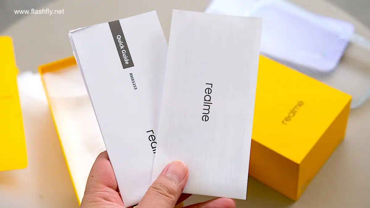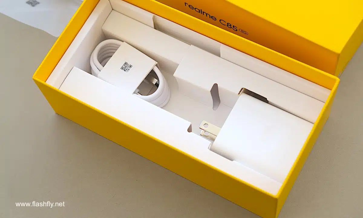 ถัดลงมาเป็นชั้นวางสมาร์ตโฟน realme C85 5G ถูกเก็บไว้ในซองอย่างดี ชั้นล่างสุดของกล่องเป็นช่องเก็บสายชาร์จ USB Type-C และ หัวชาร์จแบตเตอรี่ Power Adapter (45W SUPERVOOC)