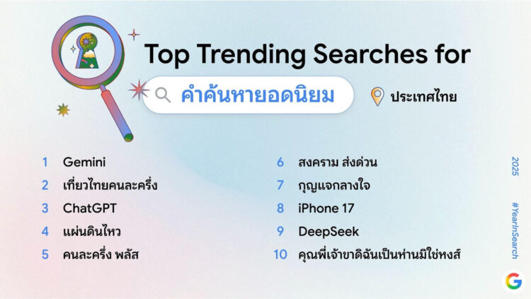 “Year in Search 2025” ซึ่งเป็นการประมวลภาพรวมว่าคนไทยสนใจเรื่องอะไรในปี 2568 ไม่ว่าจะเป็นเหตุการณ์สำคัญที่เป็นกระแส เทรนด์ AI ที่มาแรงต่อเนื่อง บุคคล และข่าวเด่นที่ถูกพูดถึงทั่วประเทศ ตลอดจนเทรนด์ท่องเที่ยวทั้งในไทยและต่างประเทศ รวมถึงกิจกรรมยอดนิยมอย่างสูตรอาหาร วิธีทำ และหมวดความบันเทิงที่ครองใจผู้ค้นหาตลอดทั้งปี