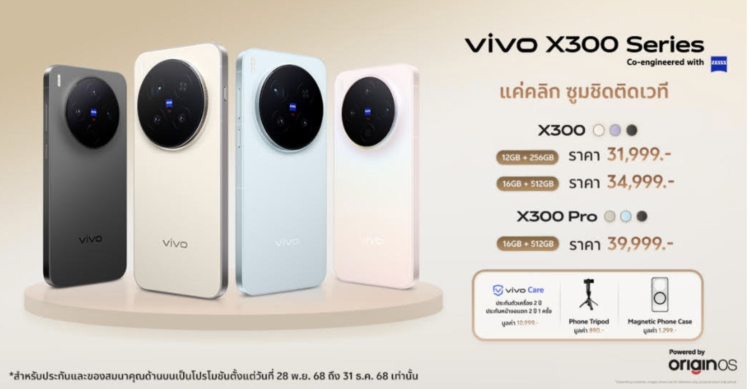 vivo แบรนด์สมาร์ตโฟนชั้นนำระดับโลก ลงสนามเรือธงถ่ายคอนเสิร์ต ส่ง vivo X300 Series เปิดตัวในตลาดประเทศไทยภายใต้คอนเซ็ปต์ ‘แค่คลิก ซูมชิดติดเวที’ ชูจุดเด่นด้านการซูมในคอนเสิร์ตที่ง่ายดายและคมชัดทั้งภาพและวิดีโอโดยไม่ต้องปรับตั้งค่าใด ๆ ให้ยุ่งยาก ด้วยเทคโนโลยีกล้องและชุดเลนส์เสริมที่พัฒนาร่วมกับพันธมิตรผู้เชี่ยวชาญอย่าง ZEISS รับประกันการใช้งานลื่นไหลด้วยขุมพลัง MediaTek Dimensity 9500 และvivo Imaging Chip V3+ พร้อมระบบปฏิบัติการใหม่ OriginOS 6 บน Android 16 ตั้งแต่แกะกล่อง ในราคาเริ่มต้น 31,999 บาทสำหรับ X300 และ 39,999 บาทสำหรับ X300 Pro