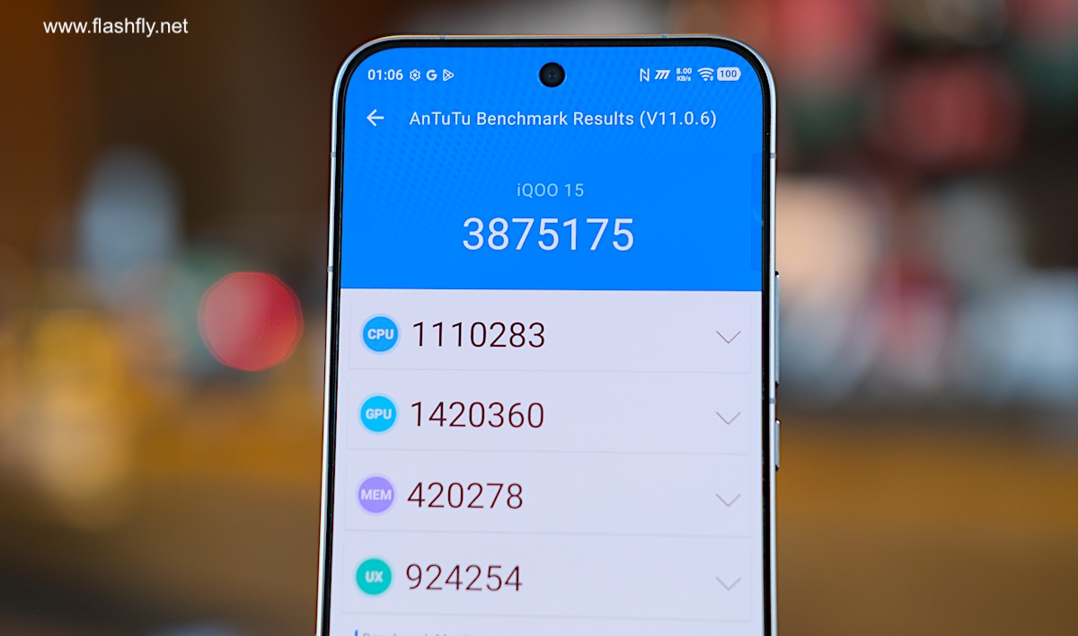 จากการทดสอบประสิทธิภาพด้วยแอปพลิเคชัน AnTuTu พบว่า iQOO 15 ทำได้สูงถึง 3,875,175 คะแนน โดยจำแนกเป็นคะแนนด้าน CPU ทำได้ 1,110,283 คะแนน, GPU ทำได้ 1,420,360 คะแนน, Memory ทำได้ 420,278 คะแนน และด้าน User Experience ทำได้ 924,254 คะแนน