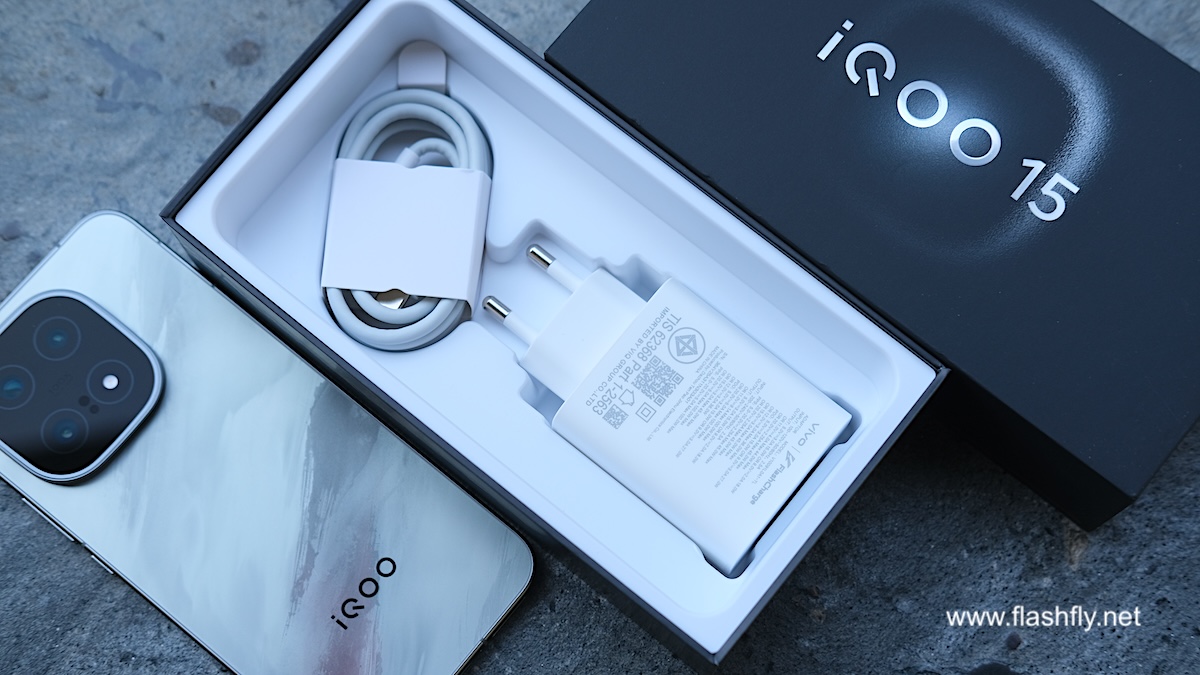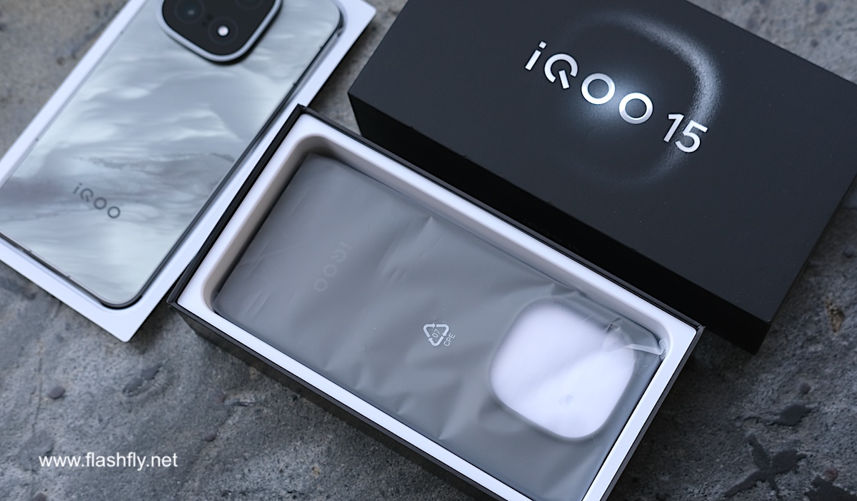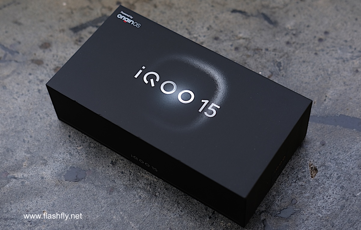 iQOO 15 จัดส่งมาในกล่องสีดำ หน้ากล่องระบุว่าใช้ระบบปฏิบัติการ OriginOS และมีชื่อรุ่น iQOO 15 ขนาดใหญ่ จัดวางในแนวนอน เมื่อยกฝากล่องขึ้นมา จะพบกับ สมาร์ตโฟนถูกห่อหุ้มไว้ในซองอย่างดี ใต้ถาดรองสมาร์ตโฟนมีเคสแถมมาให้ 1 อัน พร้อมด้วยคู่มือ Quick Start Guide รวมถึงข้อมูลสำคัญและบัตรรับประกัน