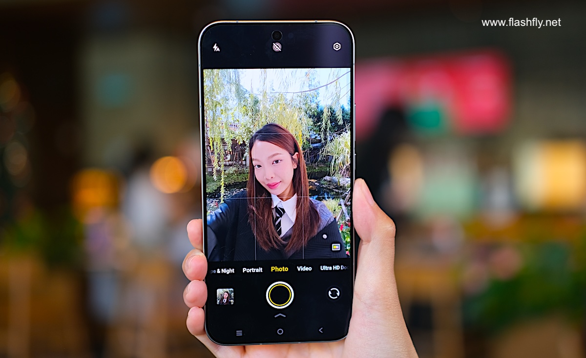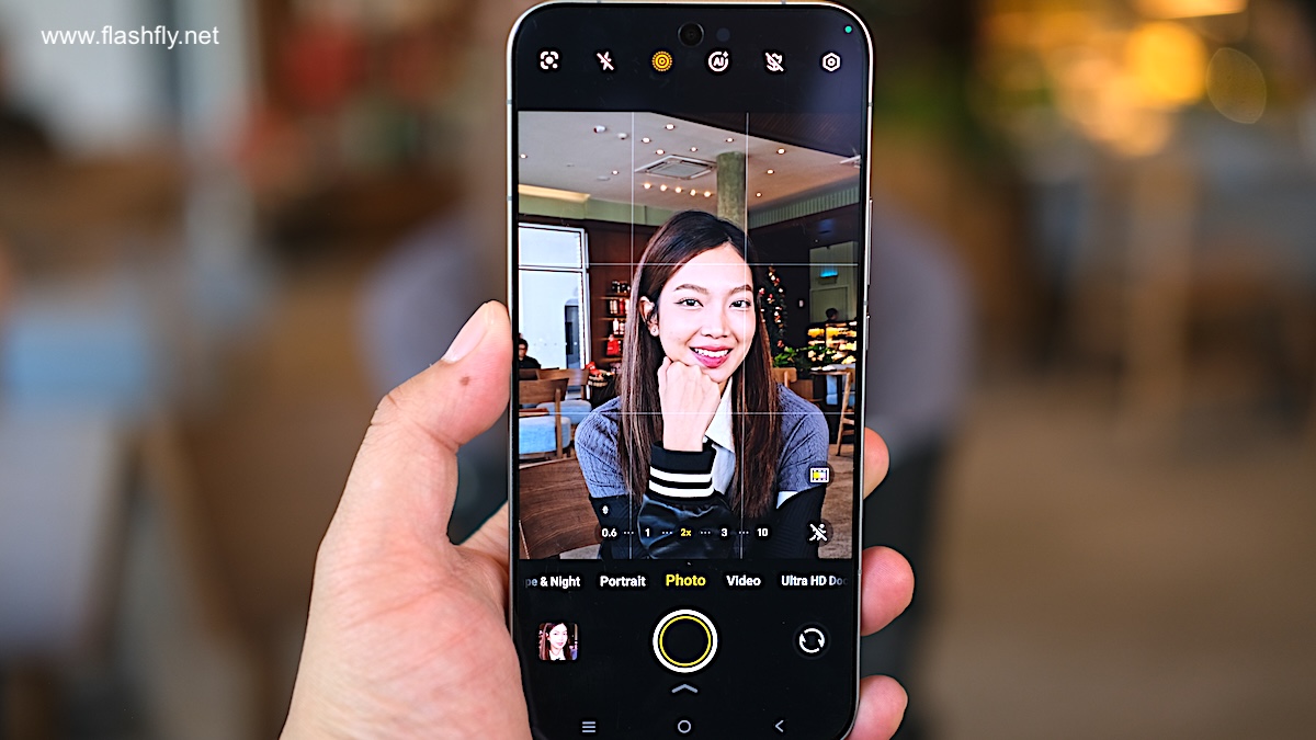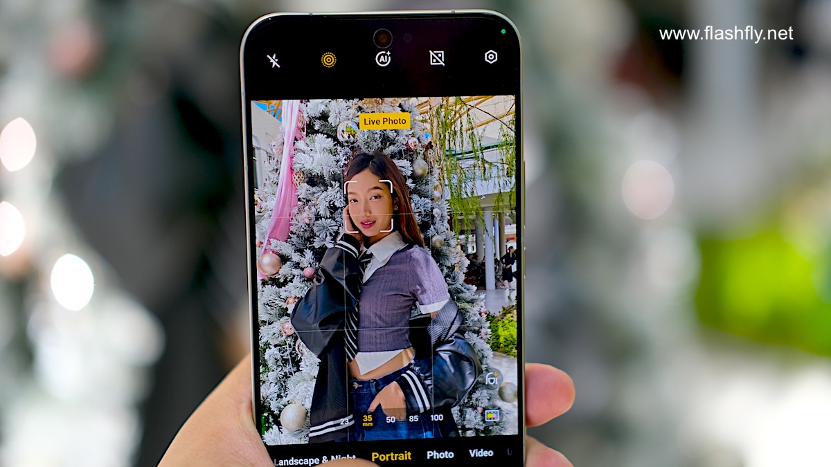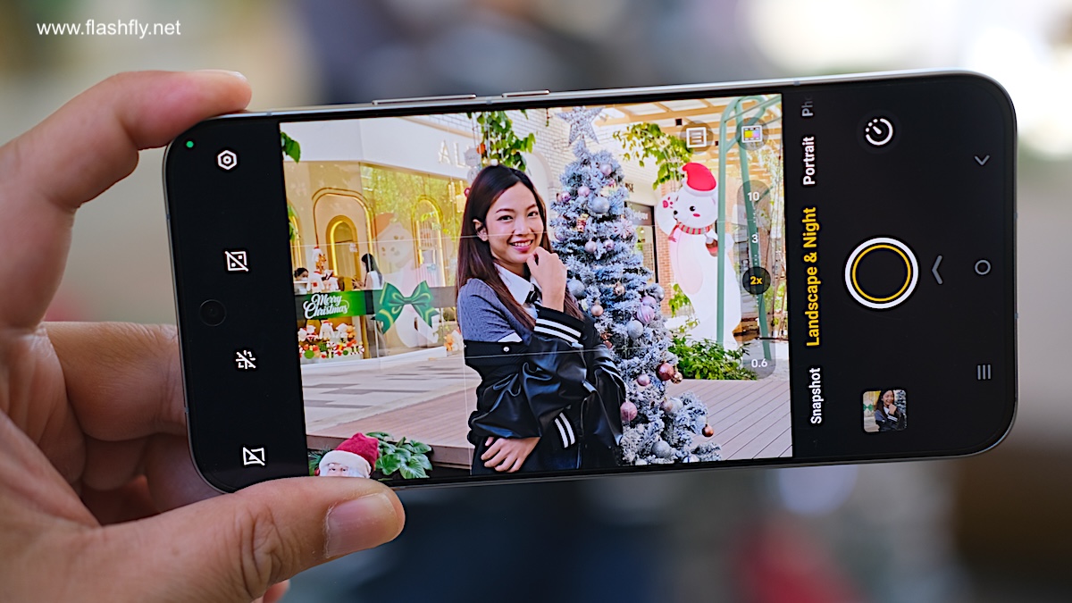 โหมด Photo รองรับการซูมตั้งแต่ระยะ 0.6x, 1x, 2x, 3x, 10x และซูมได้สูงสุด 100x แถบเครื่องมือด้านบนมีฟีเจอร์ Live Photo (อยู่ถัดจากไอคอนไฟแฟลช) ข้างกันมีไอคอน AI เอฟเฟกต์สร้างบรรยากาศให้ภาพถ่ายตามฤดูกาลต่างๆ ได้แก่ Spring, Summer, Autumn และ Winter