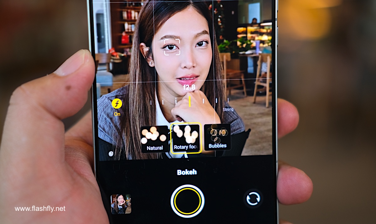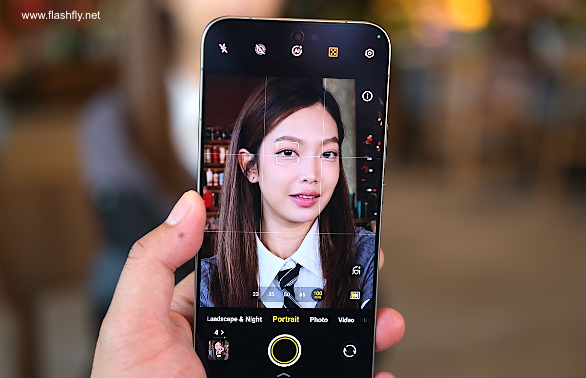 โหมด Portrait จะเปลี่ยนช่วงของการซูมเป็นระยะเลนส์หรือทางยาวโฟกัส ตั้งแต่ 23 มม., 35 มม., 50 มม., 85 มม., 100 มม. มีฟีเจอร์ปรับค่า F สำหรับละลายฉากหลัง เลือกเอฟเฟกต์ Bokeh ได้ 3 แบบ ได้แก่ Natural, Rotary Focus, Bubbles ถัดลงมาเป็นฟีเจอร์ Beauty ช่วยปรับความงามบนใบหน้า และมีฟิลเตอร์ให้เลือกใช้หลายแบบ แบ่งเป็นหมวดหมู่ Basic styles และ Personalized Styles