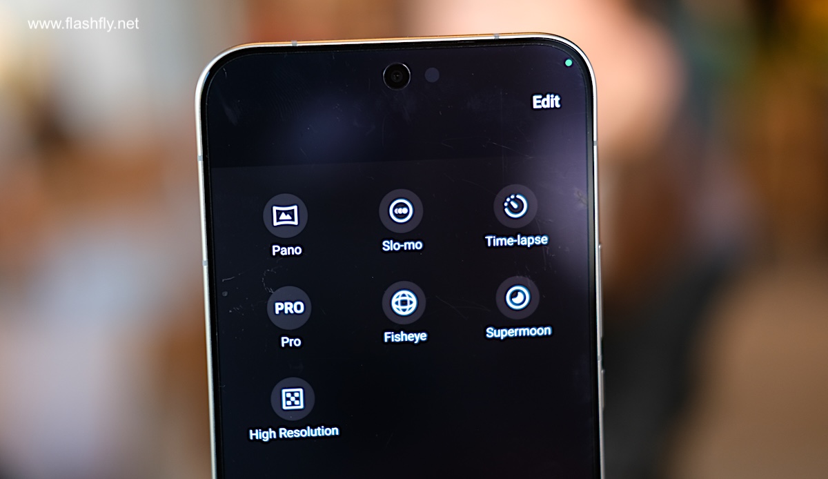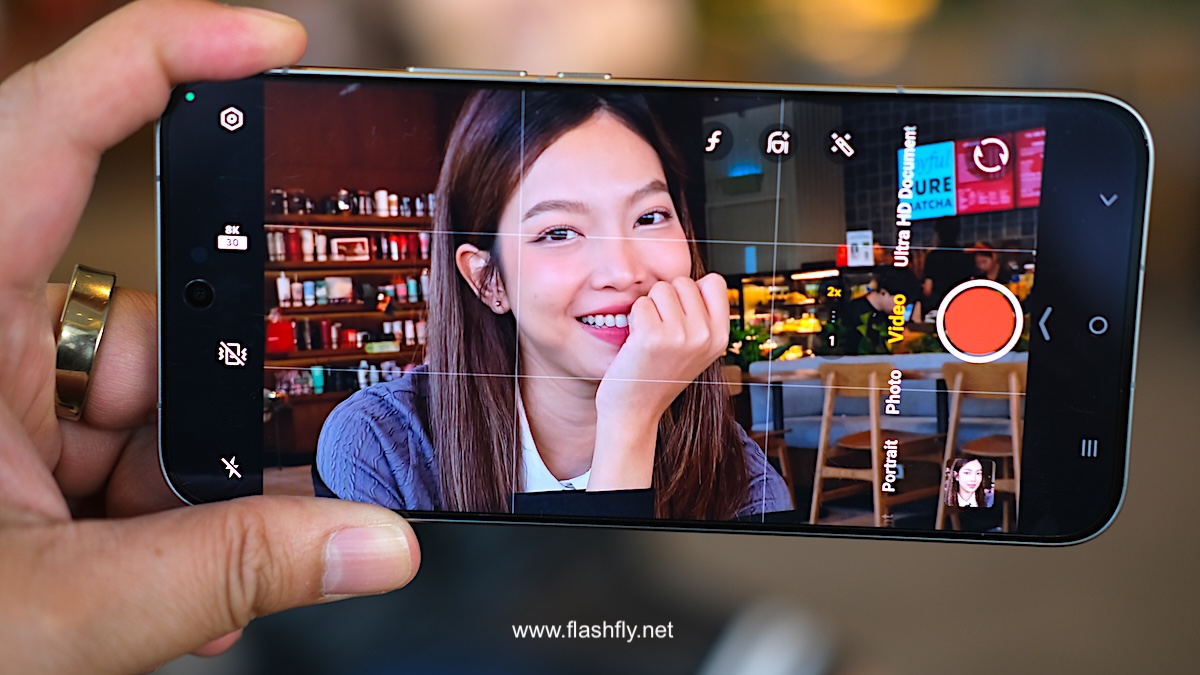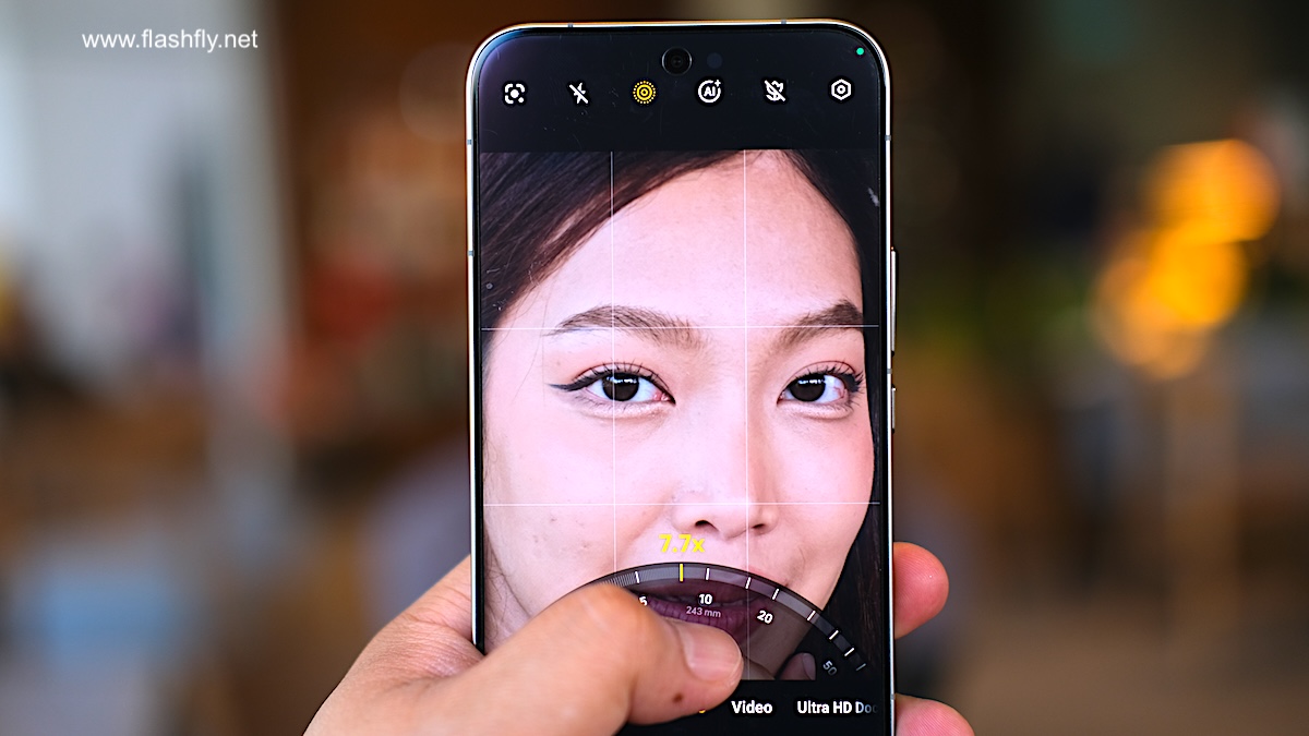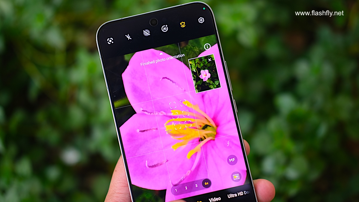 และไอคอนรูปดอกไม้ คือโหมดถ่ายภาพ Super Macro สำหรับถ่ายภาพใกล้วัตถุ ซูมได้สูงสุด 6x โดยระยะ 1x ใช้กล้อง Ultra Wide ระยะ 2x – 6x ใช้กล้องหลักทำ Super Macro