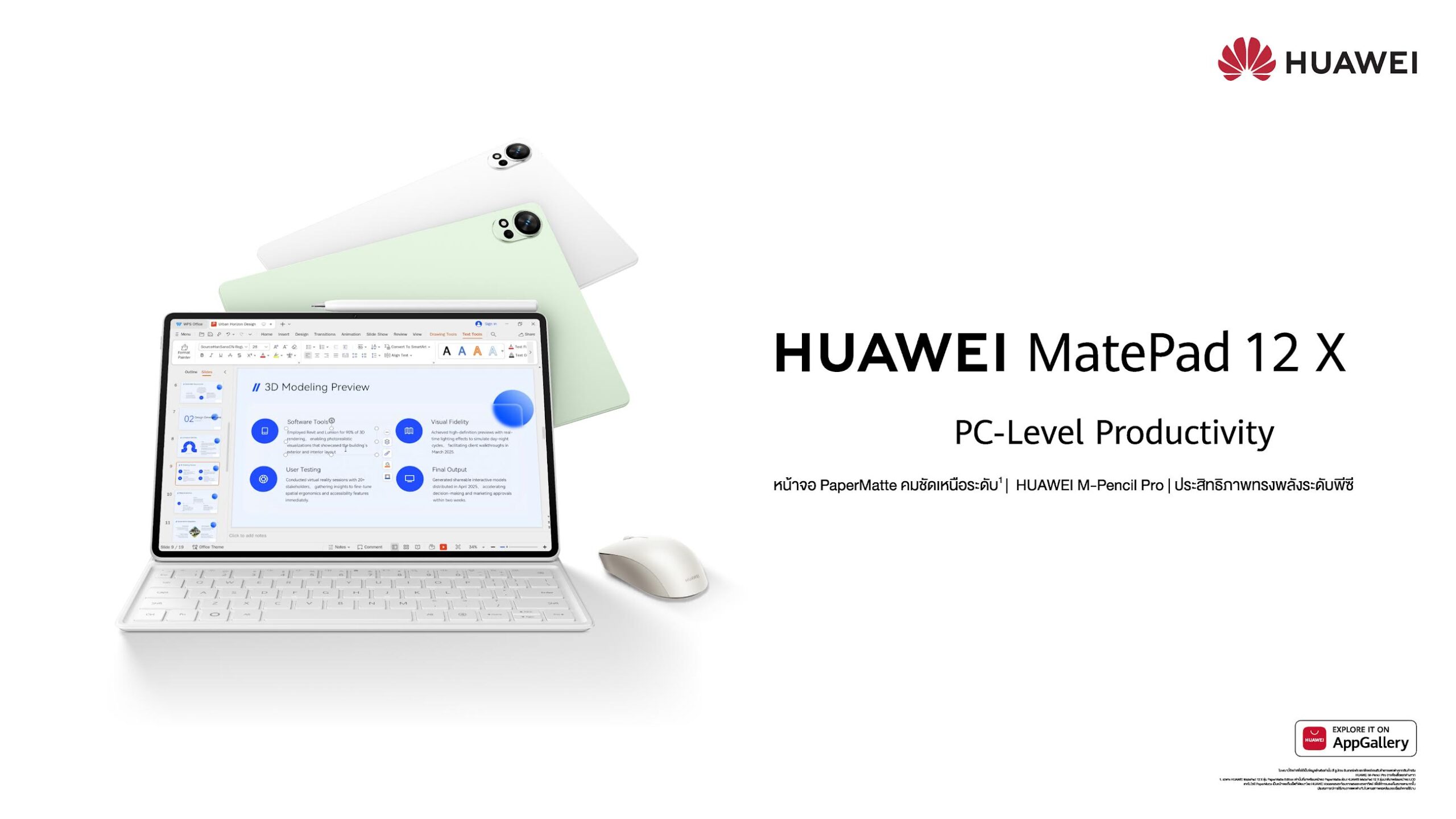 หัวเว่ย คอนซูมเมอร์ บิสสิเนส กรุ๊ป (ประเทศไทย) เปิดตัว HUAWEI MatePad 12 X (2026) สุดยอดแท็บเล็ตเรือธงรุ่นใหม่ล่าสุด ที่พร้อมที่ยกระดับประสบการณ์การใช้งานระดับพีซีไปอีกขั้น ก้าวข้ามขีดจำกัดการทำงานในยุคปัจจุบัน ด้วยความคมชัดเหนือระดับด้วย Ultra-Clear PaperMatte Display เพิ่มขีดความสามารถในการทำงานสูงสุดด้วย PC-level WPS Office 3.0และจินตนาการไม่รู้จบที่รังสรรด้วย HUAWEI M-Pencil Pro HUAWEI MatePad 12 X (2026) พร้อมเป็นผู้ช่วยคู่ใจให้มืออาชีพและนักสร้างสรรค์ในยุคปัจจุบันและปลดล็อกศักยภาพได้อย่างเต็มที่ พร้อมข้อเสนอพิเศษมากมาย นอกจากนี้ยังเตรียมพบกับกิจกรรมสุดพิเศษ “HUAWEI VIP Preview: Pre-Experience & Discover HUAWEI” ระหว่างวันที่ 20 ธันวาคม 2568 – 21 ธันวาคม 2568 ณ HUAWEI Authorized Experience Store 8 สาขาทั่วกรุงเทพฯ และปริมณฑล สัมผัสประสบการณ์การใช้งานจริงของแท็บเล็ตเรือธงรุ่นใหม่ก่อนการวางจำหน่ายอย่างเป็นทางการพร้อมกัน