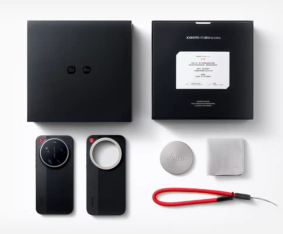 Xiaomi 17 Ultra by Leica เพิ่มความโดดเด่นกว่าด้วยโลโก้ Leica สีแดง และดีไซน์แบบทูโทนที่ได้รับแรงบันดาลใจจากกล้อง Leica M-series นอกจากนี้ ยังมาพร้อมโหมด Leica Moment พิเศษในอัตราส่วนภาพ 3:2 ภายในกล่องยังแถมฝาปิดเลนส์ สายคล้องคอ เคสแม่เหล็ก และผ้าทำความสะอาด