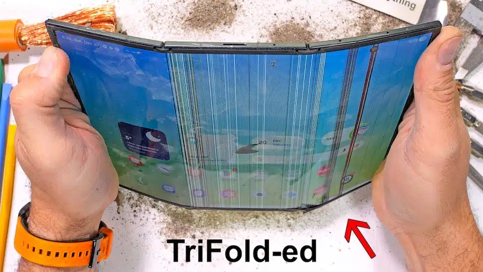 มาถึงการทดสอบที่หลายคนให้ความสนใจ นั่นคือการทดสอบหักตัวเครื่องด้วยมือเปล่า โดยผู้ทดสอบพบว่า Galaxy Z TriFold มีจุดอ่อนที่บริเวณเส้นเสาอาการ ประกอบกับความบางของตัวเครื่อง ทำให้อุปกรณ์ได้รับความเสียหายทั้งจอแสดงผล และบางส่วนของตัวเครื่องที่แตกหัก