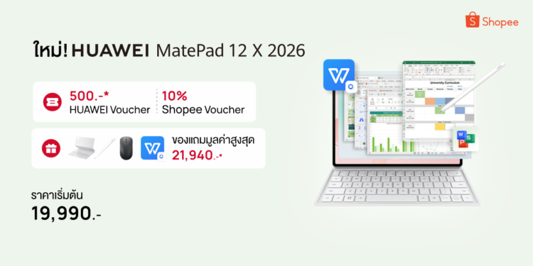 หัวเว่ย คอนซูมแมอร์ บิสสิเนส กรุ๊ป จับมือกับ Shopee ผู้นำแพลตฟอร์มอีคอมเมิร์ซในเอเชียตะวันออกเฉียงใต้ พานักช้อปสัมผัส “ขั้นกว่า” ของประสบการณ์การใช้งานแท็บเล็ตด้วย HUAWEI MatePad 12 X (2026) ที่ยกสมรรถนะจัดเต็มในระดับเดียวกับเครื่องพีซี ซึ่งเหนือชั้นไปอีกขั้นด้วยการใช้งานที่ลื่นไหลยิ่งกว่า ฟีเจอร์ที่ชาญฉลาดกว่า และดีไซน์ที่บางเบากว่าใคร พร้อมตอบโจทย์ทั้งการทำงานระดับโปรและความบันเทิงเต็มรูปแบบ ในราคาเริ่มต้นที่ 19,990 บาท ที่ร้านค้าหัวเว่ยอย่างเป็นทางการบน Shopee เท่านั้น พร้อมยกทัพข้อเสนอและของสมนาคุณสิทธิพิเศษรวมถึง 21,940 บาท