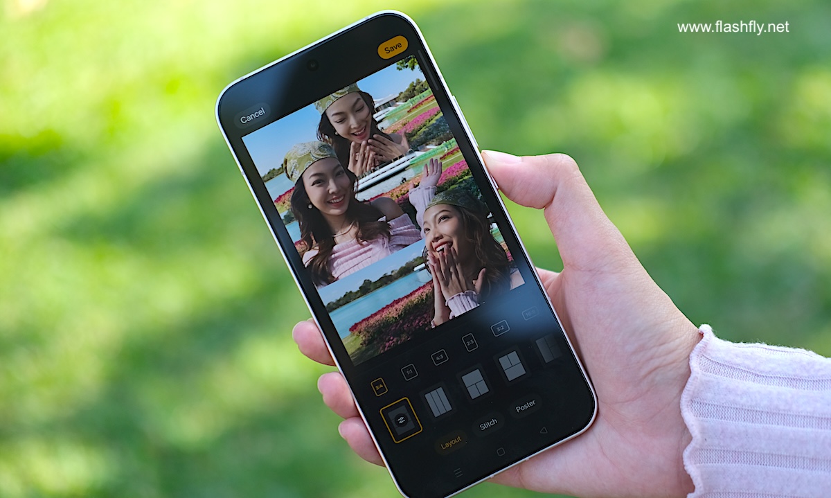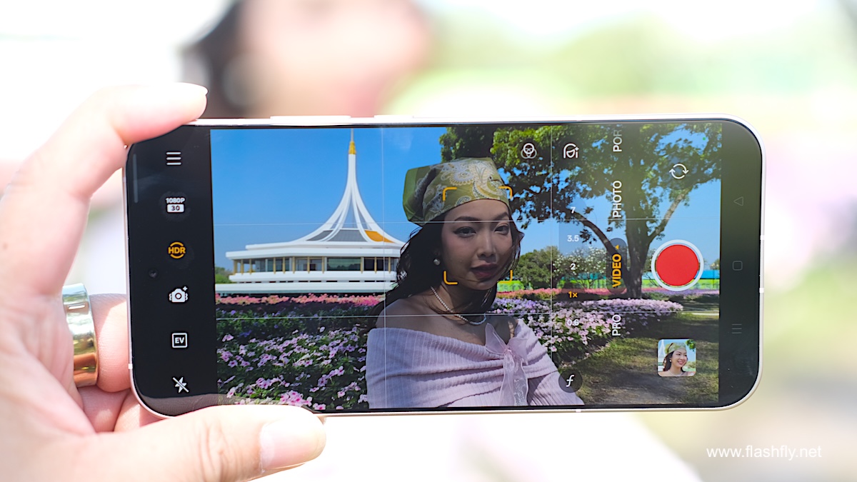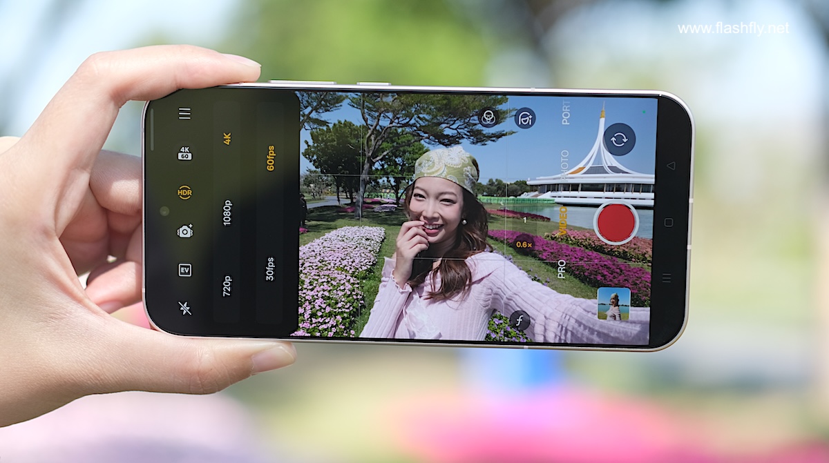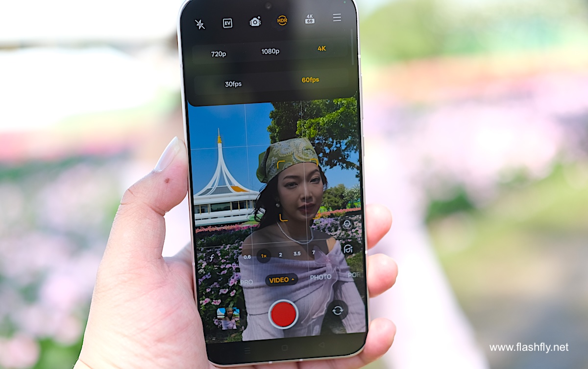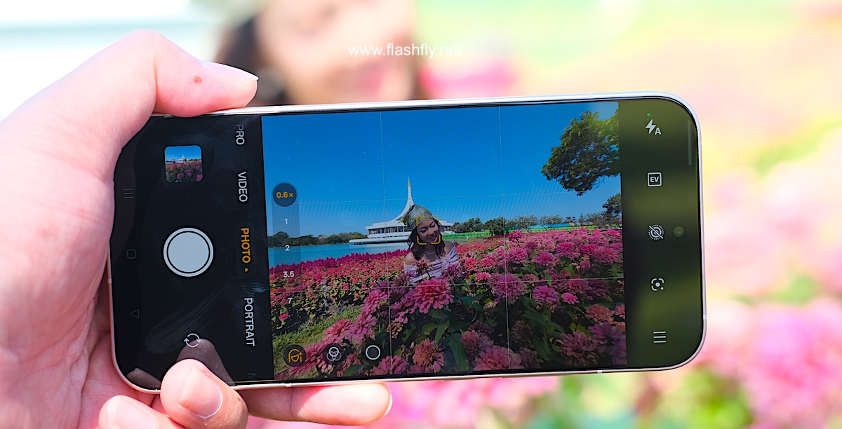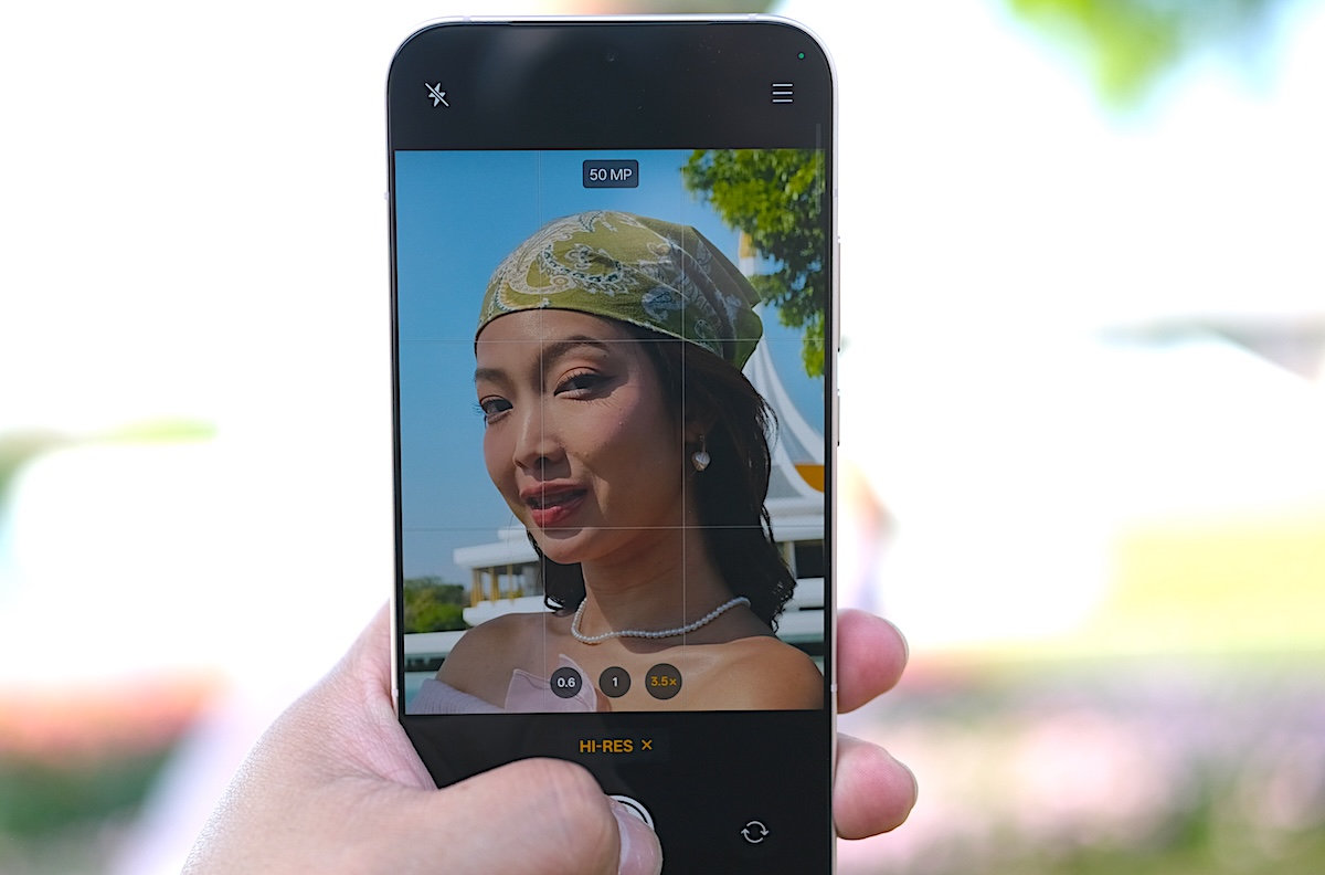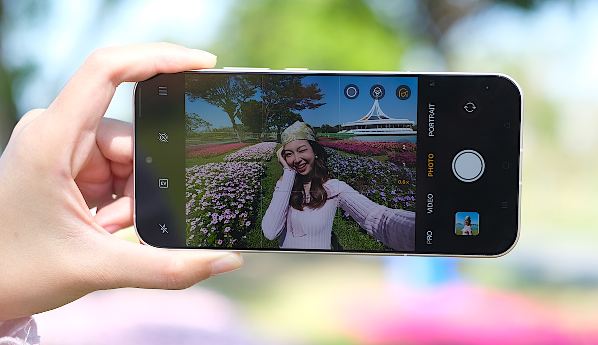 โหมด Photo รองรับการซูมตั้งแต่ระยะ 0.6x ซึ่งเป็นการเปิดใช้งานกล้อง Ultra Wide ,1x ,2x ,3.5x และ 7x จากนั้นสามารถซูมได้สูงสุด 120x พร้อมปรับความคมชัดด้วย AI โดยมีฟีเจอร์ Soft Light (ไอคอนวงกลม) ช่วยสร้างเอฟเฟกต์แสงที่มีความนุ่มนวล เลือกได้ 3 สไตล์ ได้แก่ Misty, Glowy และ Dreamy ถัดลงมาเป็นไอคอน Filters เช่น Neon (เหมาะสำหรับถ่ายภาพภายใต้แสงไฟนีออนตามท้องถนนหรือในเมืองยามค่ำคืน), Cold flash (เหมาะสำหรับถ่ายภาพพอร์ตเทรตด้วยไฟแฟลชภายใต้สภาวะแสงน้อย), Warm flash (คล้ายกับ Cold flash แต่ให้แสงโทนอุ่น), Fresh (เหมาะสำหรับถ่ายภาพตามชายหาด สวนสาธารณะ รวมถึงในร่ม), Emerald (เหมาะสำหรับถ่ายภาพตามท้องถนน ร้านอาหาร คาเฟ่), Clear (เหมาะสำหรับถ่ายภาพพอร์ตเทรตเมื่ออยู่นอกอาคาร), Vivid และมีฟีเจอร์ Retouch สำหรับปรับแต่งใบหน้าให้ดูดียิ่งขึ้น