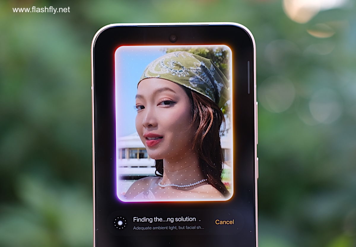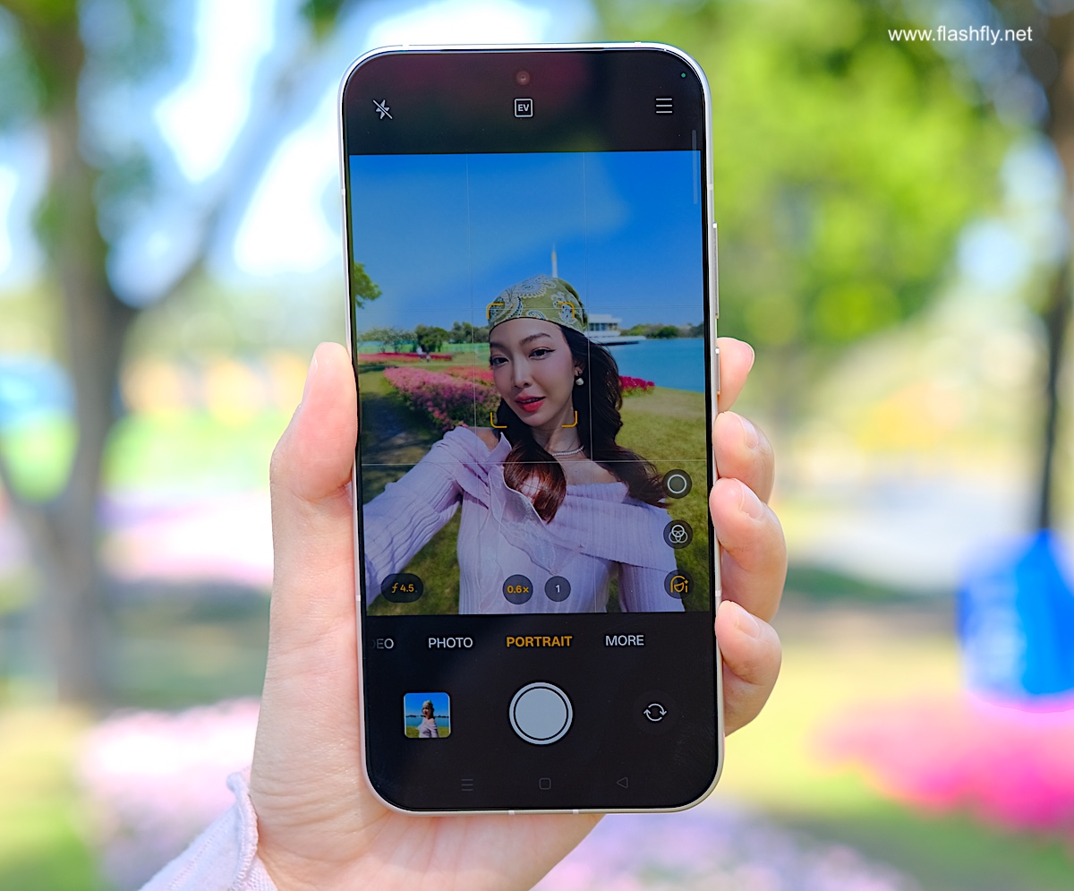 โหมด Photo ของกล้องหน้า สามารถซูมได้ 3 ระยะ 0.6x / 1x / 2x มาพร้อมฟีเจอร์ Soft Light สร้างเอฟเฟกต์แสงที่มีความนุ่มนวล เลือกได้ 3 สไตล์ ได้แก่ Misty, Glowy และ Dreamy ถัดลงมาเป็น Filters ที่มีตัวเลือกหลากหลาย เช่น Neon, Fresh, Emerald, Clear, Vivid, Radiance ขณะที่เครื่องมือ Retouch สำหรับปรับแต่งใบหน้าให้ดูดียิ่งขึ้น ผู้ใช้งานยังสามารถปรับค่าชดเชยแสง EV ได้จากแถบเครื่องมือด้านบน และข้างกันเป็นฟีเจอร์ Motion Photo