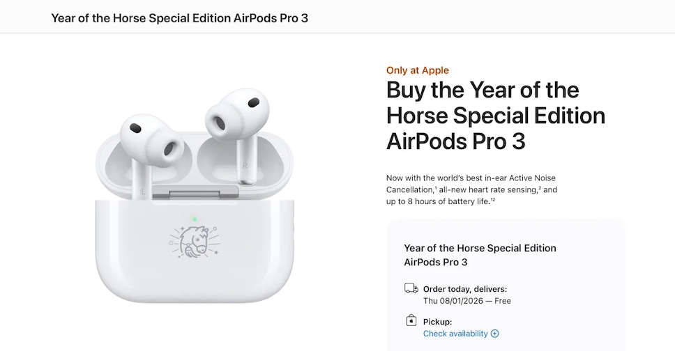 AirPods Pro 3 รุ่นพิเศษ Year of the Horse พร้อมวางจำหน่ายแล้วในร้านค้าของ Apple ทั้งออนไลน์ และร้านค้าปลีก ในประเทศดังกล่าว โดยจำกัดการซื้อไม่เกิน 2 ชิ้น และถ้าหากได้รับความเสียหาย Apple จะทดแทนด้วย AirPods Pro 3 รุ่นมาตรฐาน