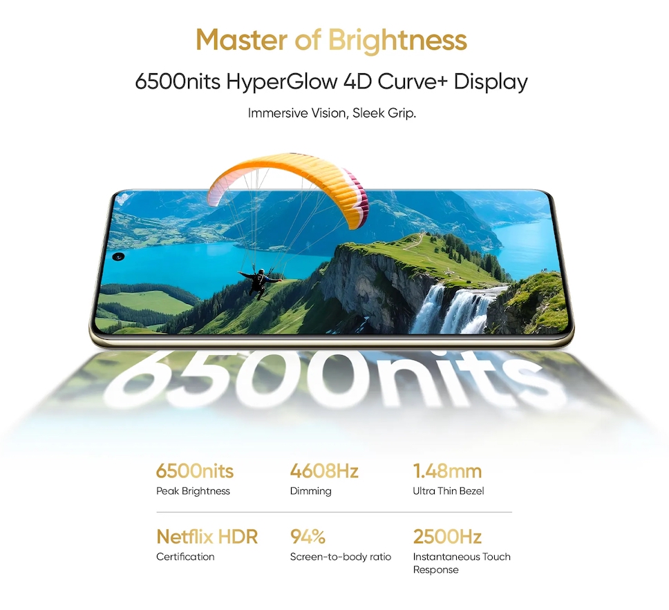 realme 16 Pro+ 5G มาพร้อมจอแสดงผล AMOLED ความละเอียด 1.5K ขนาด 6.8 นิ้ว ให้อัตราการรีเฟรช 144Hz ติดตั้งเซ็นเซอร์สแกนลายนิ้วมือแบบออปติคัลบนหน้าจอ มีกล้องหน้า 50 ล้านพิกเซล ใช้ชิปประมวลผล Qualcomm Snapdragon 7 Gen 4 ความจำ RAM 8/12GB (LPDDR5X) จับคู่กับ ROM 256/512GB ความจุแบตเตอรี่ 7000mAh รองรับชาร์จเร็ว 80W SUPERVOOC