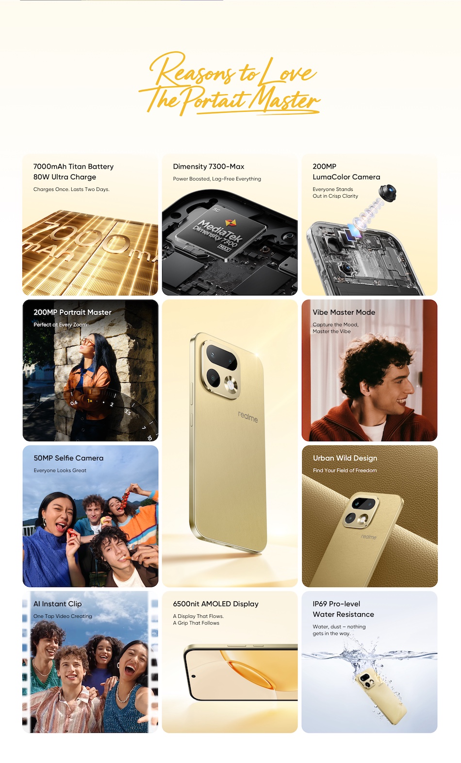 realme 16 Pro 5G สามารถป้องกันฝุ่นและน้ำในระดับ IP66 / IP68 / IP69 / IP69K มีให้เลือก 3 สี ได้แก่ Master Gold, Pebble Grey และ Orchid Purple (สีชมพูมีเฉพาะในอินเดีย) ราคาเริ่มต้น 31,999 รูปี หรือราว 11,090 บาท
